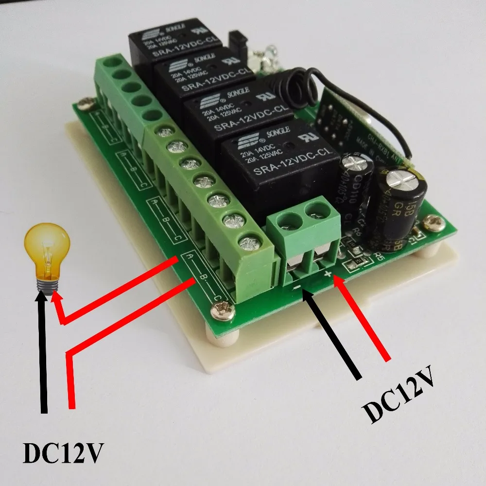 1. Рабочее напряжение: DC12V -/+ 10% 2. Ток: Стандартный ≤ 10 мА, рабочий ≤ 128 мА 3. Рабочая температура: -10'C-+ 60'C 4. Частота приемника: 315 МГц/433,92 МГц 5. Чувствительность приема:-105дБ 6. Выходное состояние: значение для переключения 7. Максимальная нагрузка: реле 10А, резистивная нагрузка ≤ 8А, Индуктивная нагрузка ≤ 3A 8. Размер платы приемника: 68 × 48 × 13 мм 9. Размер Чехла: 75 × 55 × 30 мм Тип кодирования: код обучения, добавить передатчик с помощью кнопки обучения на приемнике Выходное состояние: регулируется перемычкой на плате приемника, Мгновенный ---------- джемпер на «M & Mid Pin» Переключение --------------- Перемычка «T & Mid Pin» Защелкивается ------------------------------------------------------------------------------------------------ Мгновенный ------------ нажмите кнопку передатчика A, реле приемника A Включено, отпустите кнопку A; Реле приемника A выключено, то же, что и B/C/D. 4CH независимы. Переключение ------------------ нажмите кнопку передатчика A 1 раз, реле приемника A Включено, нажмите кнопку A снова, реле приемника A выключено, то же, что и B/C/D. 4CH независимы. Защелкивается -------------------- Нажмите кнопку передатчика A, реле приемника A Включено, реле B/C/D выключено. Нажмите кнопку передатчика B, реле приемника B включено, реле A/C/D выключено. Нажмите кнопку передатчика C, реле приемника C включено, реле A/B/D выключено Нажмите кнопку передатчика D, реле приемника D включено, реле A/B/C выключено. Это также означает. Запирается только на 1CH. И у него часто будет 1CH. Код обучения Входная мощность для приемника. Продолжайте нажимать кнопку обучения, пока не появится светодиодный индикатор. Затем нажмите на передатчик любую кнопку, светодиодный индикатор выключен, затем нажмите любую кнопку передатчика, вы услышали ответ реле, это означает, что обучение успешно. Код Очистки Удерживайте кнопку обучения на приемнике до тех пор, пока светодиодный индикатор не выключается, это означает, что код был успешно очищен.