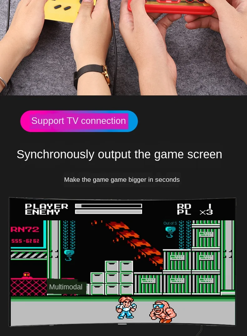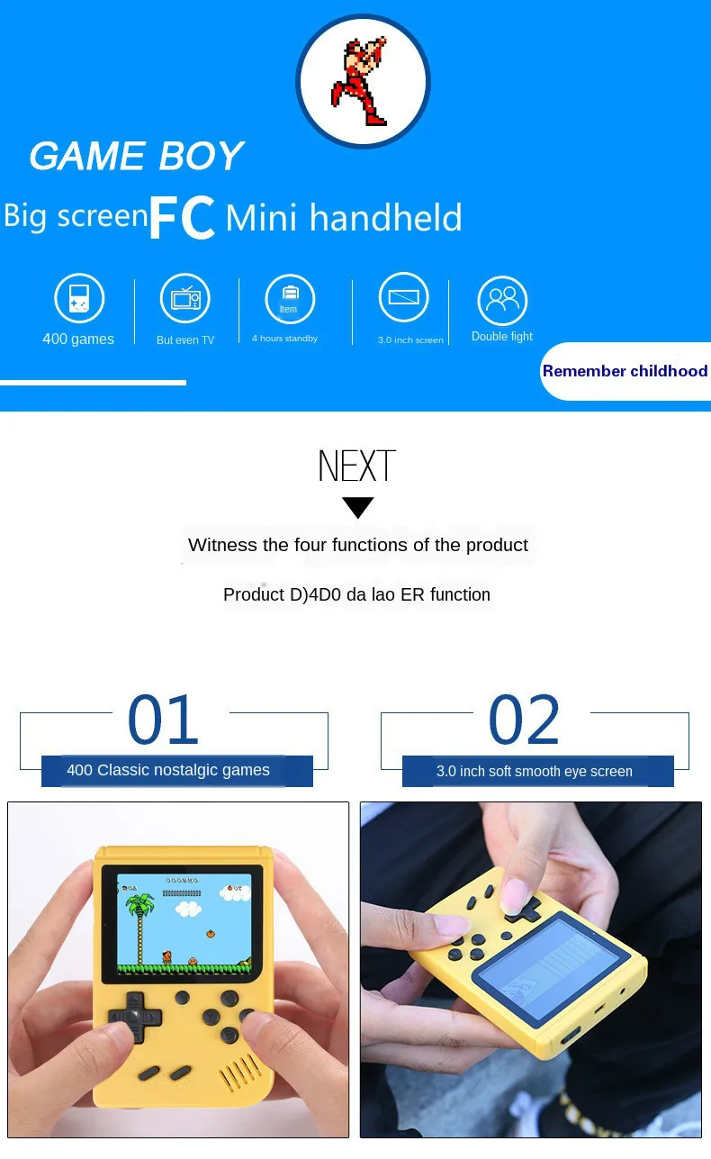 Усовершенствованная портативная игровая консоль FC, стандартные встроенные 400 не повторяющихся игр, может поддерживать выход телевизора, совместимая ручка поддерживает двойной бойХарактеристики: для двойных игровых консолей все геймпады красного цвета по умолчаниюЦвет: черный/белый/синий/красныйЭкран: 3,0 дюймов TFT цветной ЭкранИгра Функция: Поддержка 8-битных игр, Встроенный 400 игрыДругие функции поддерживают подключение к телевизоруАккумулятор: встроенный аккумулятор 1020 мАч, может работать в течение 6 часовПоддерживаемые языки: английский, китайскийПосылка включает в себя:1x мини портативная игровая консоль1x av-кабель1 перезаряжаемый литиевый аккумулятор1x Руководство пользователя