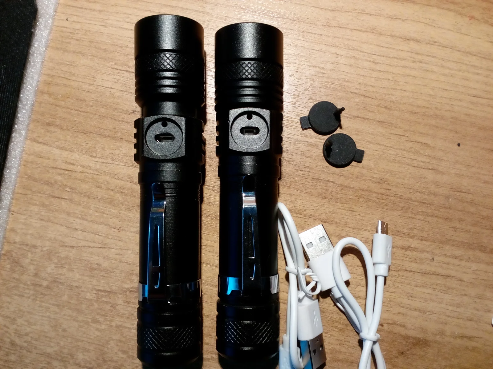 Фонарики хорошие,качество высокое, но резиновые колпачки закрывающие USB по вылазили и обратно ни как не вставить.Наверное придется разбирать. Опция режима мигания лишняя. Посылка шла долго 1.5 месяца.
