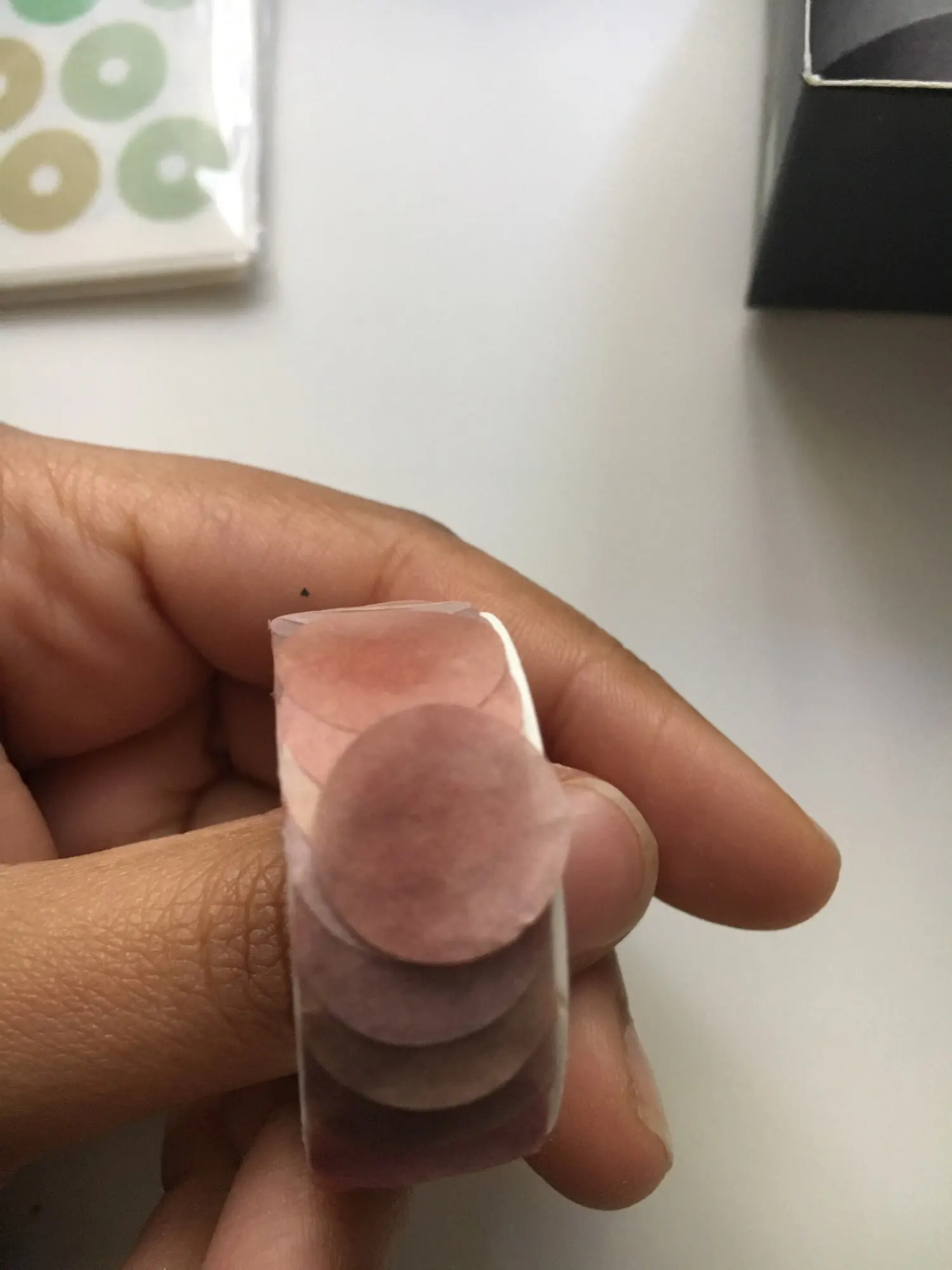очень классные кружочки, хорошо клеятся и хорошо отклеиваются. диаметр около сантиметра