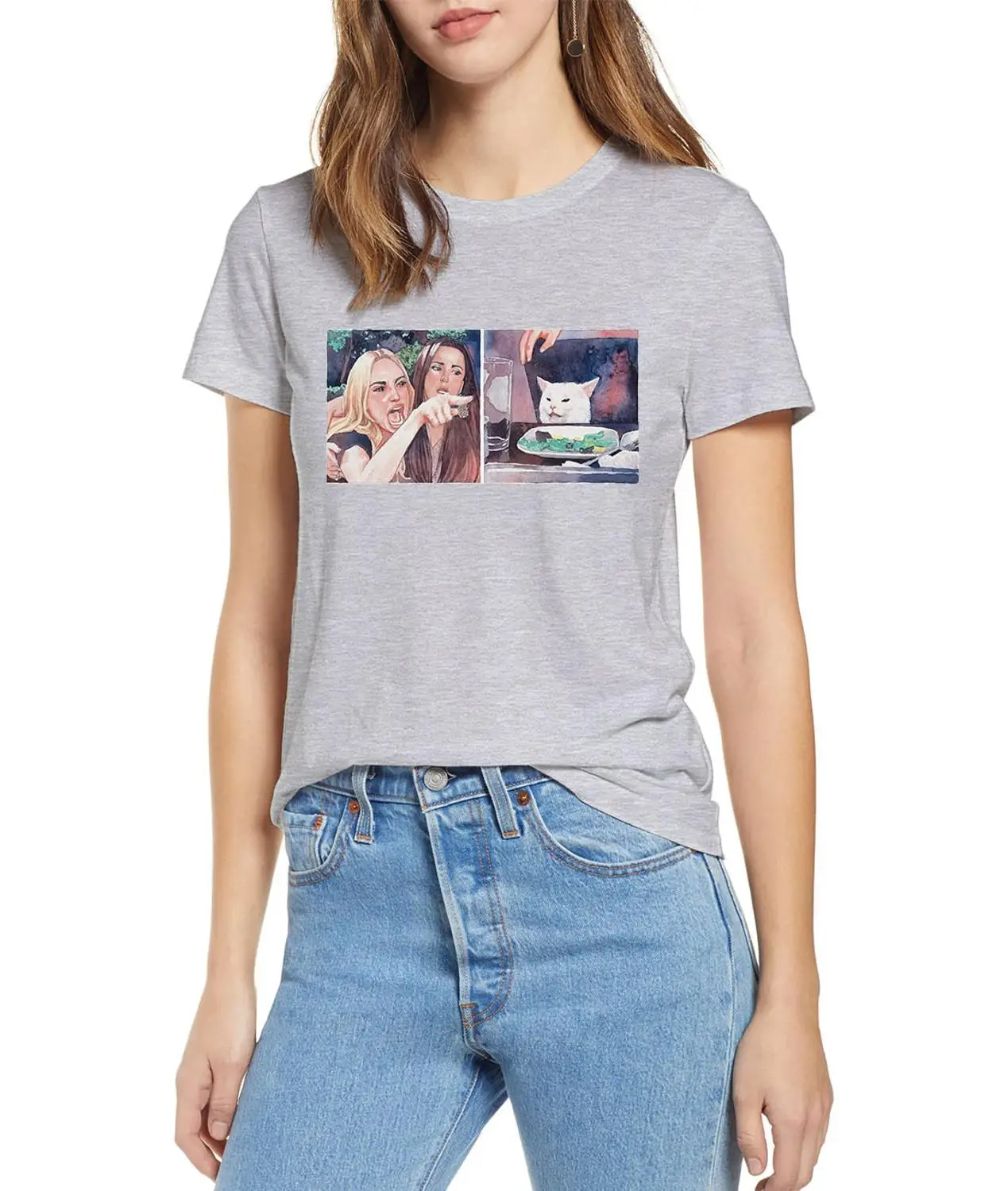 Футболка Мужскаяженская с коротким рукавом, забавная тенниска из 100% хлопка с рисунком уродливого зла, плача на спутанном Коте у обеденного стола