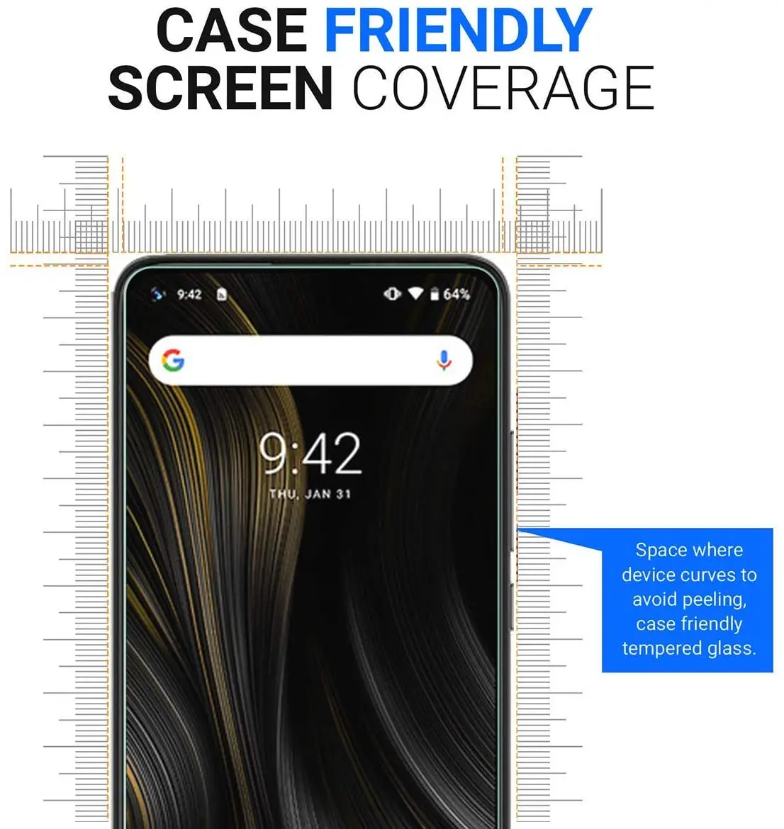 Дизайн меньше, чем экран телефона по краям, закрывает только плоскую область дисплея, чтобы соответствовать всем чехлам.