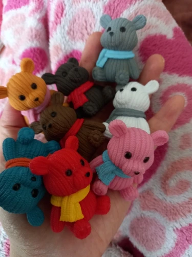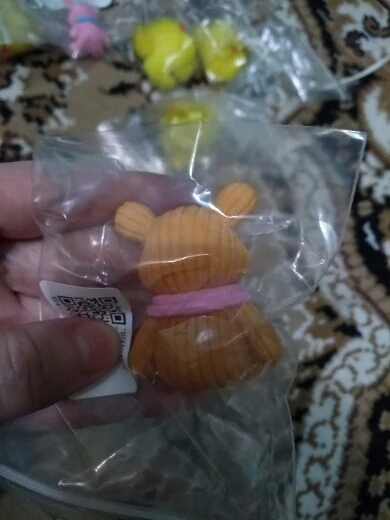 У розового медведя подплавлен кончик уха.Остальных мишек всё в порядке.