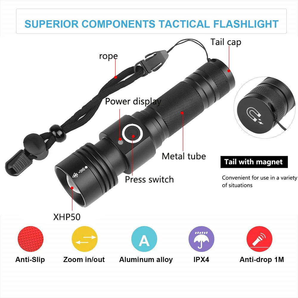 Ультра мощный светодиодный светильник для вспышки USB Перезаряжаемый масштабируемый фонарь XHP50 XHP70 ручной светильник 26650 18650 батарея флэш-светильник