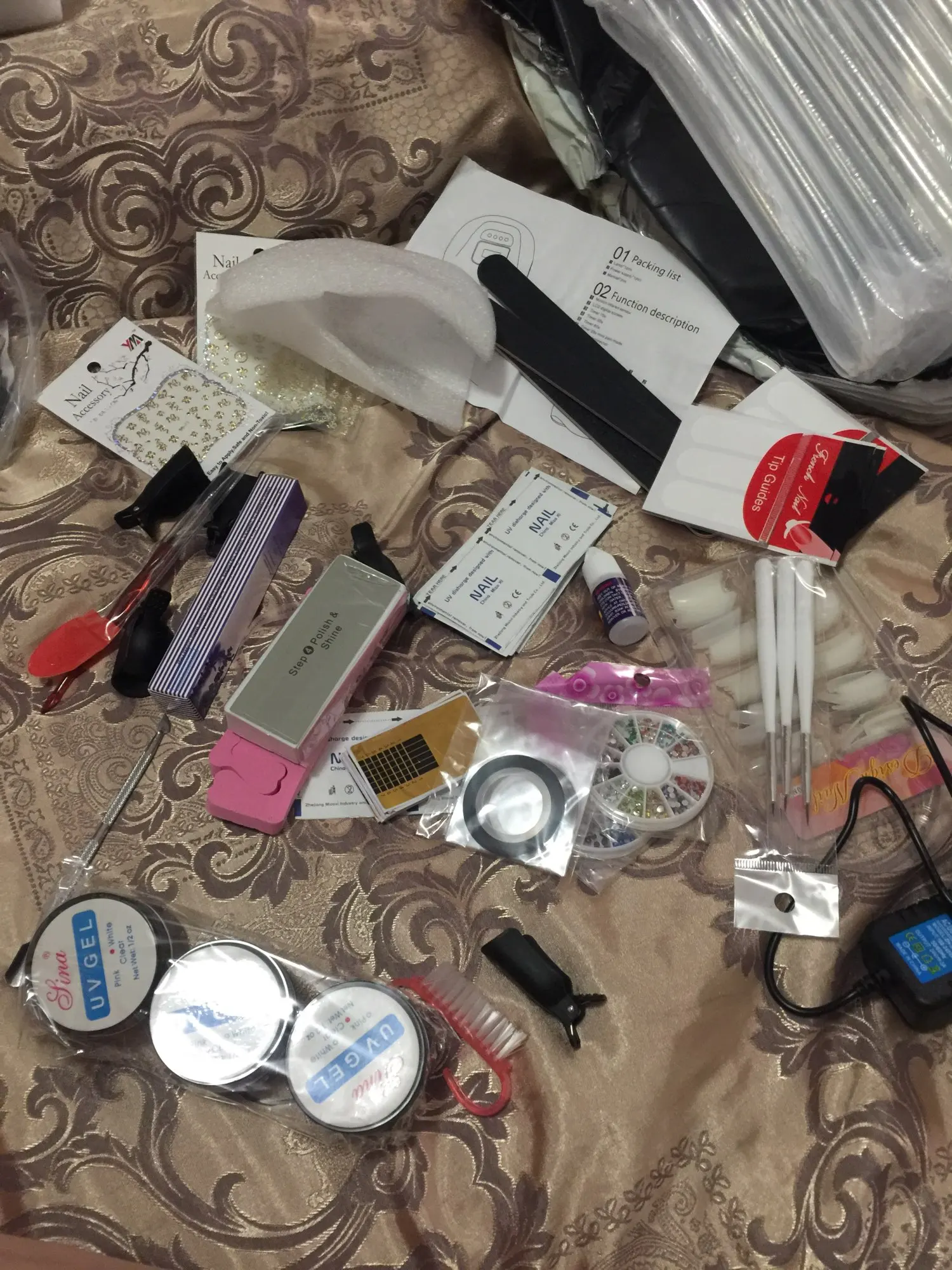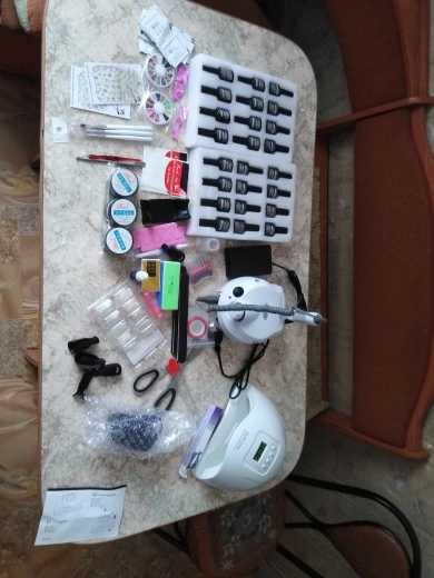 Пришло не быстро, но это виновата фирма доставки CDEK! Продавец все быстро оформил и отправил. Пришло все целое, хорошо запакованное, вся техника работает. Маникюрная дрель крутиться, лампа включается, горят все лампочки, датчик работает. Если вынуть руку из лампы она погаснет. Из лаков ничего не разлилось, но баночки очень маленькие, и настолько легкие, что кажется не заполнены и до половины. На качество не пробовала пока, но на первый осмотр гель лаки показались очень уж густыми, как бы не кукожились в лампе. Посмотрим. А вот одна из баночек с гелем протекла немного, но самую малость. Пушеры и пилки качества не очень, но за такие деньги и как первый стартовый набор все просто прекрасно. Большое спасибо продавцу. Товар советую, если вы хотите с чего-то начать но на дорогие средства пока нет денег.