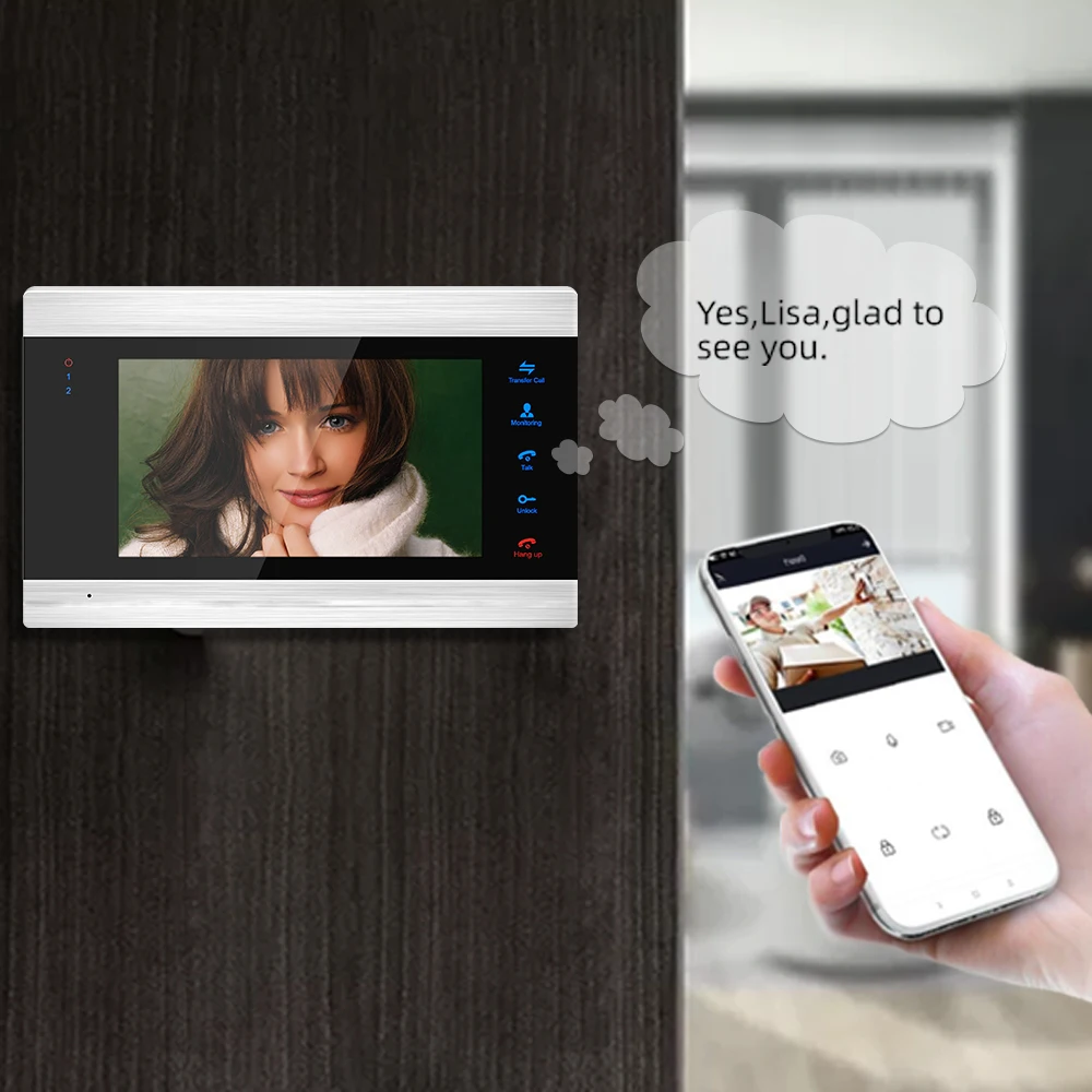 Это видеодомофон с функцией Wi-Fi, которая поддерживает работу с мобильными телефонами, когда Посетитель нажимает на дверной звонок, ваш телефон получит уведомление приложения, это означает, что вы можете использовать приложение для открытия двери, разговаривайте с посетителями, смотрите видео и так далее, когда Посетитель нажимает дверной звонок, ваш телефон получит уведомление приложения