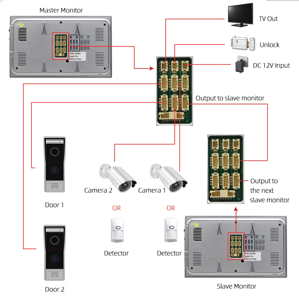 Поддержка монитора для подключения 6 внутренних мониторов, 2 замков, 2 панели вызова и 2 камеры наблюдения в основном, этот товар является бесплатным и доступен для двусторонней связи. Он поддерживает связь между внутренним монитором и наружной камерой, но также поддерживает связь между монитором и монитором. Вы не всегда спустились вниз, откройте дверь после установки нескольких домофонов