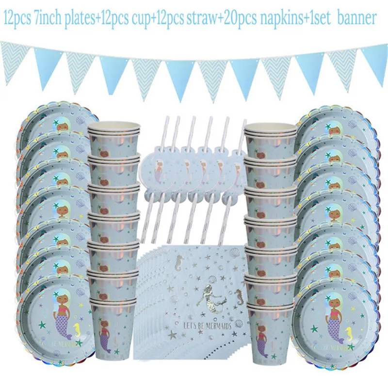 Набор одноразовых бумажных стаканчиков и тарелок русалка, посуда для вечеринки в честь Дня Рождения, декорации вечеринок