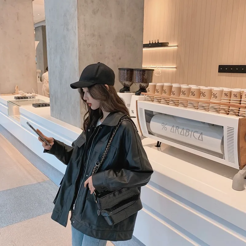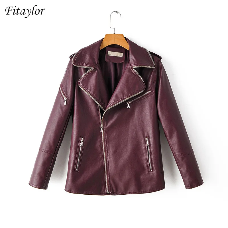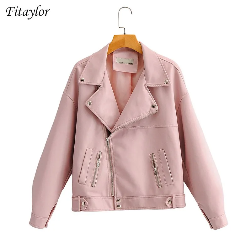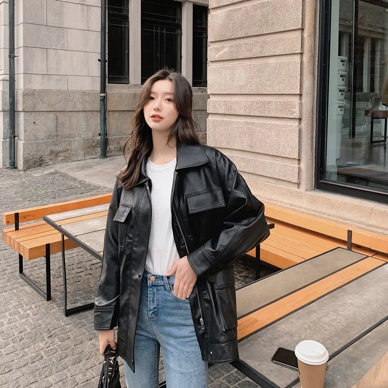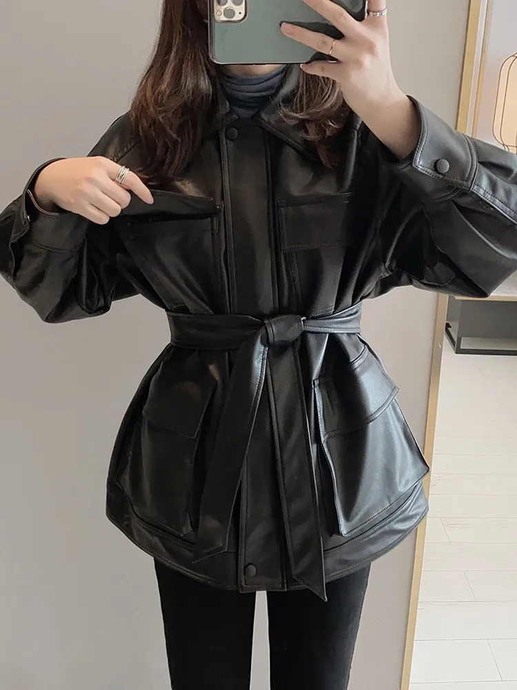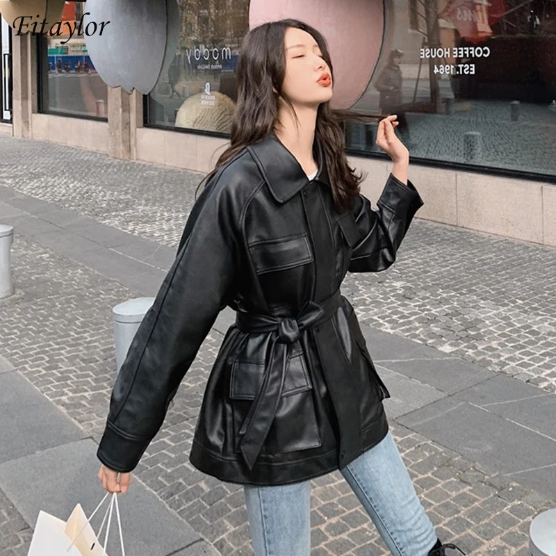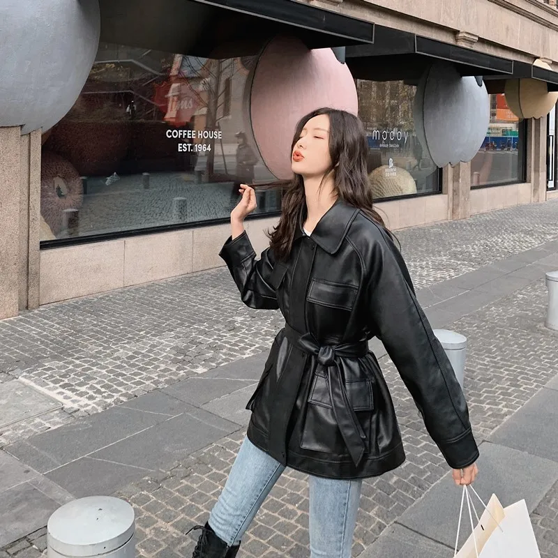 Fitaylor Новая Осенняя Женская свободная длинная Черная куртка из искусственной кожи с поясом повседневная женская уличная куртка из искусственной кожи байкерская куртка с карманами