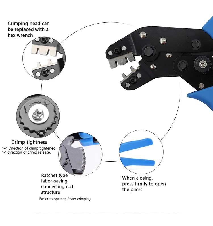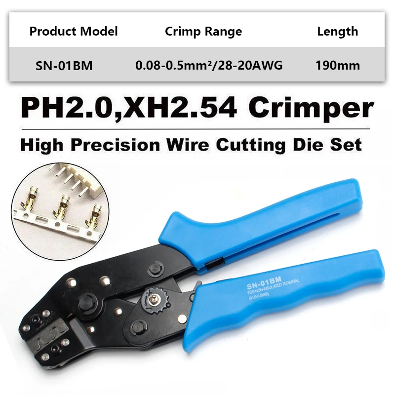 Ёмкость из AWG28-20 (0,08-0.5mm м²)Точная пресс-линия: проволочный электрод режущая челюсть обеспечивает Высокоточный результат обжима.Трудосберегающий, удобный, прочный: эргономичный дизайн для обжима клемм, экономия труда 50%, удобный захват, прочный, прочный и простой в использованииХрапового типа компоненты зажима линии давления изготовлены из специальной углеродистой стали, материал ручки PP + TPRПодходит для разъема PH2.0, XH2.54, KF2510, AWG28-20, JST, Molex,Servo