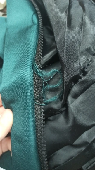 Очень много торчащих ниток. Ткань юбки просвечивает, подклада нет. Вместо чулков - колготки.