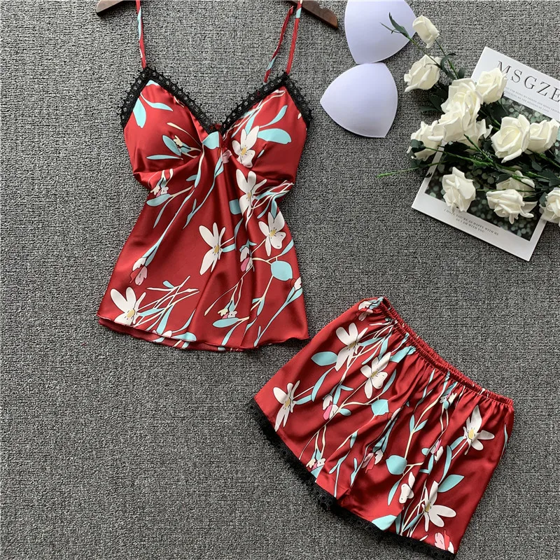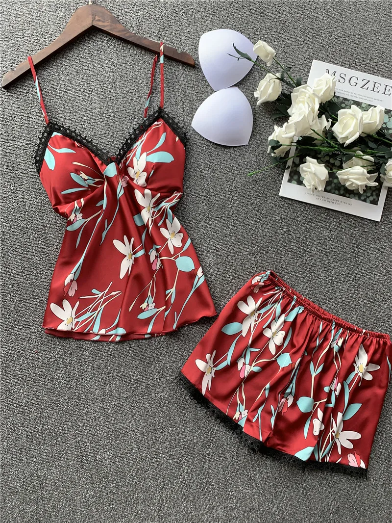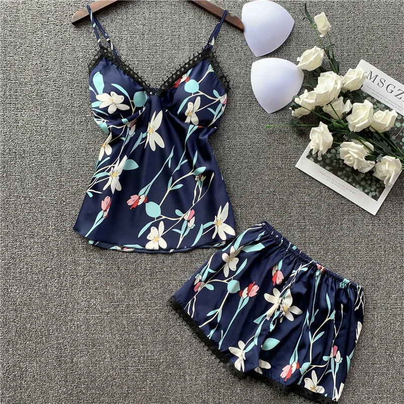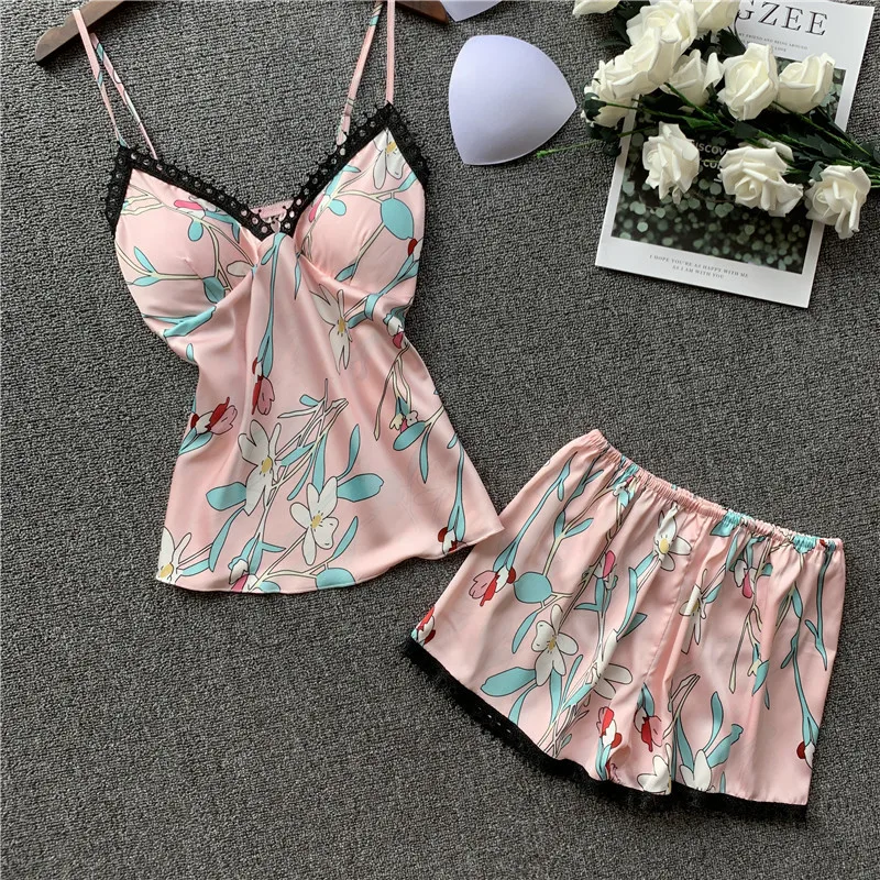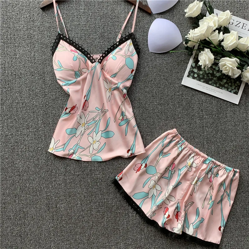 Женские пижамные комплекты из 2 предметов с цветочным принтом, мягкая вискозная одежда для сна, элегантные ремешки на бретельках и шорты, домашняя одежда, Женская пижама, нагрудная подушка