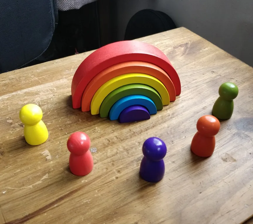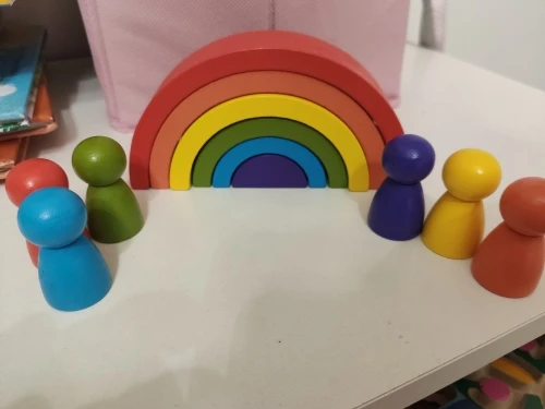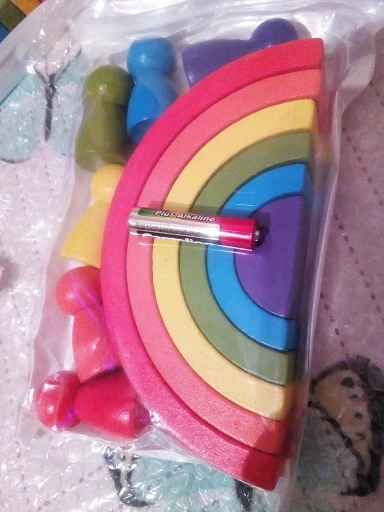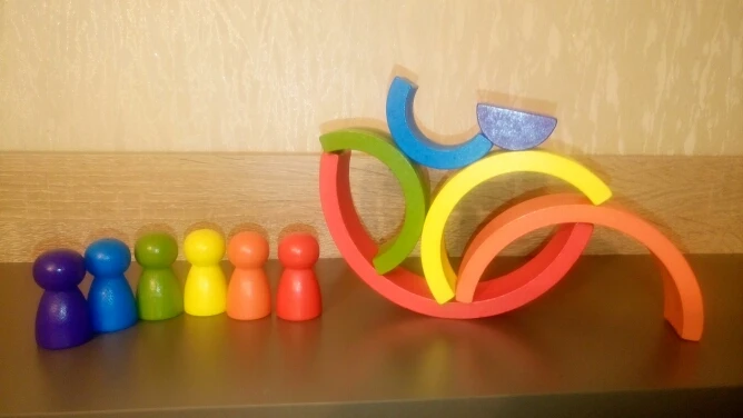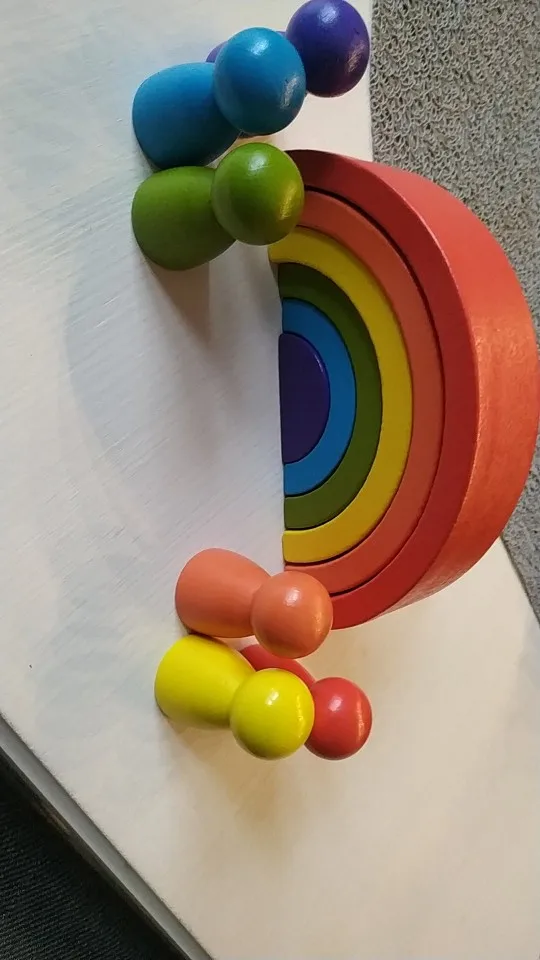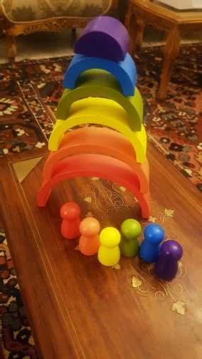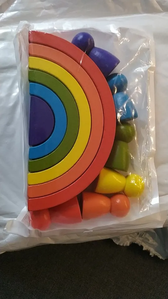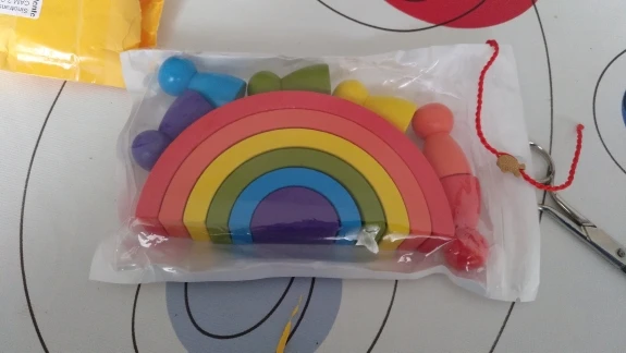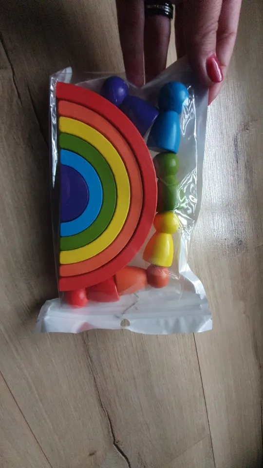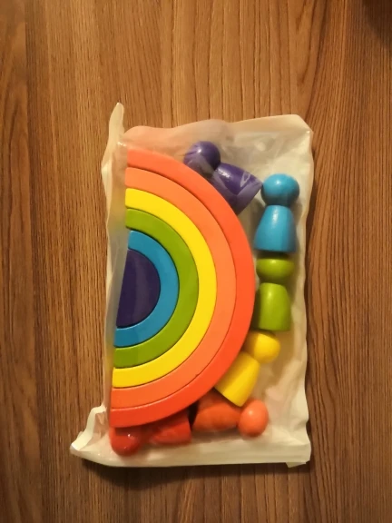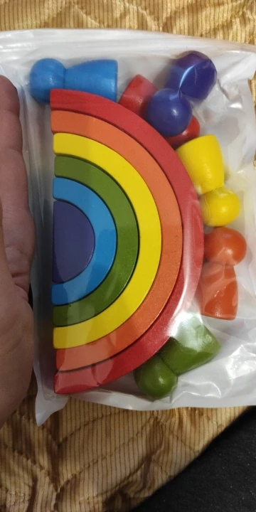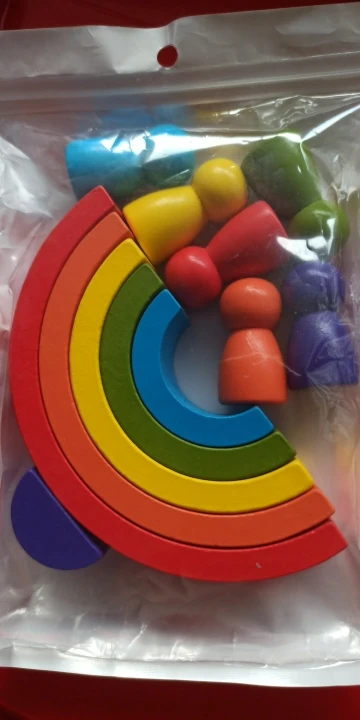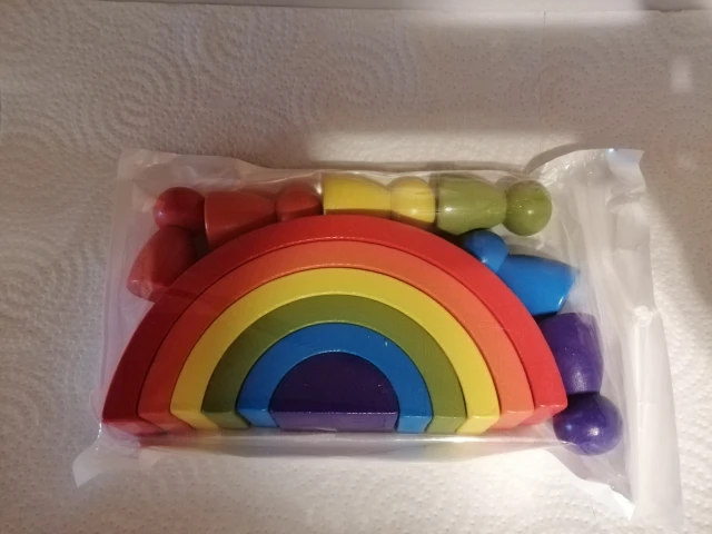 Без скидки дорогая радуга получается. Покупала примерно за 500 рублей. Размер небольшой. Есть небольшой дефект дерева, но прокрашено все хорошо. Без мешка для хранения.