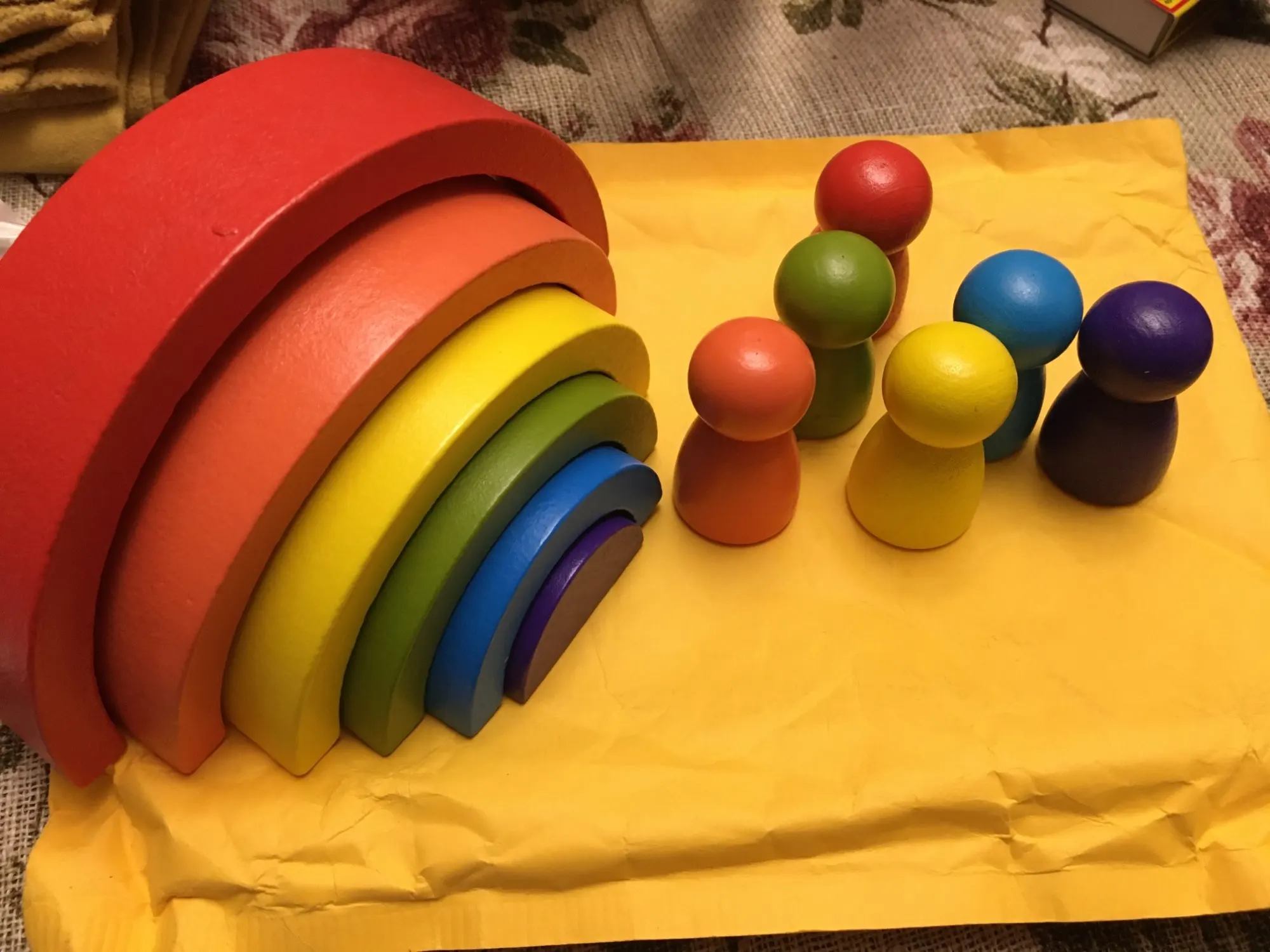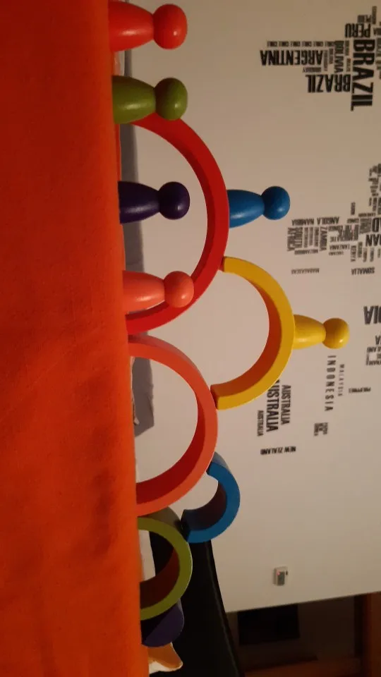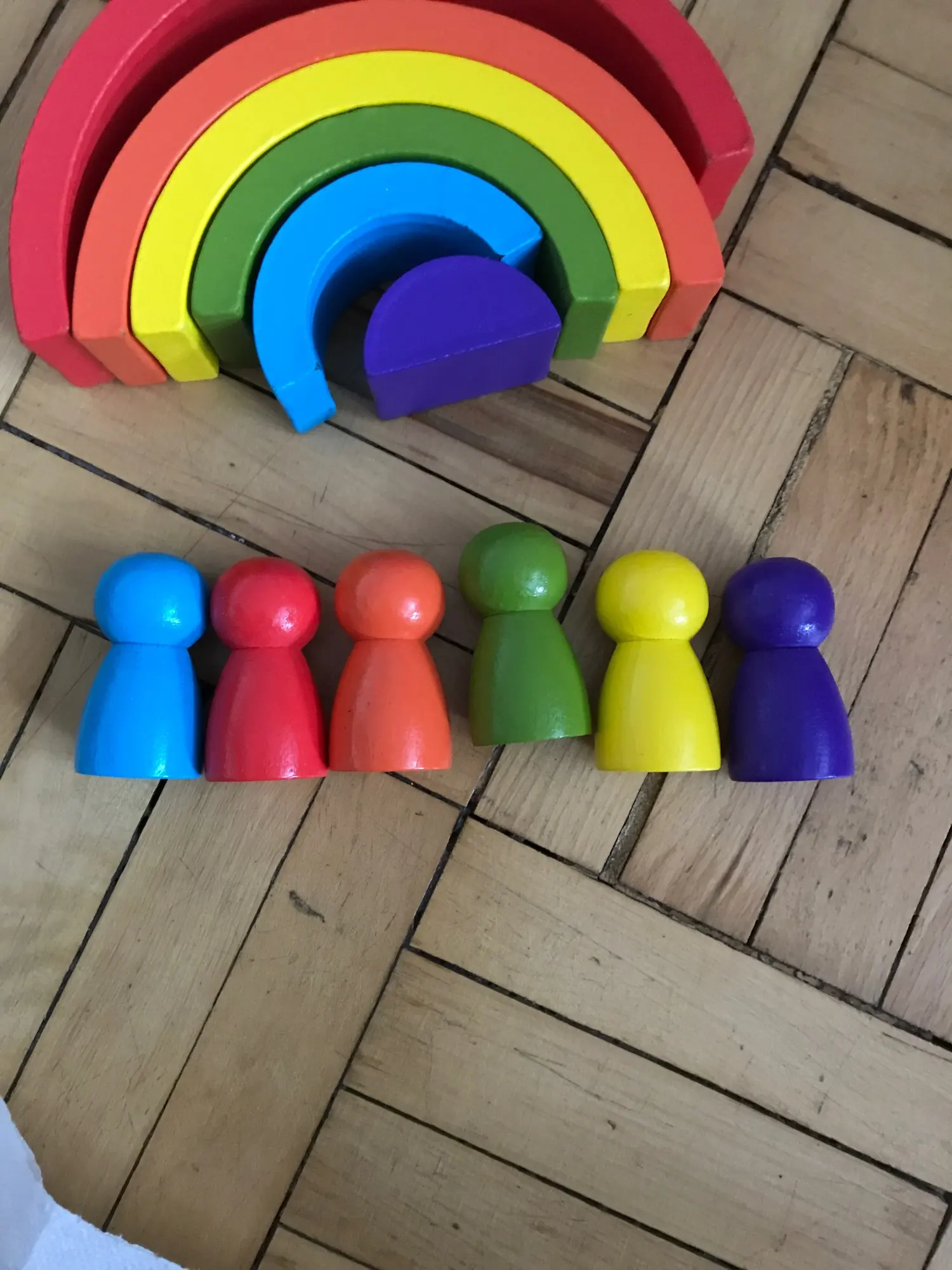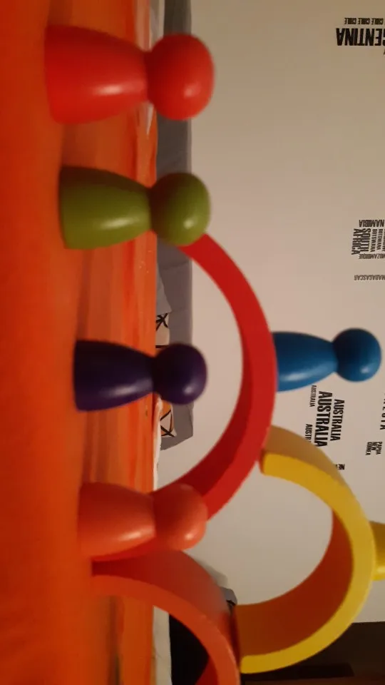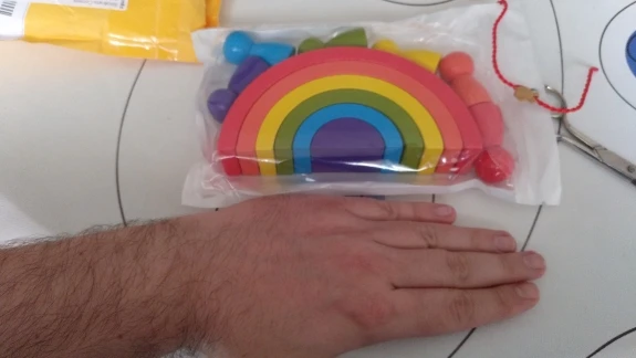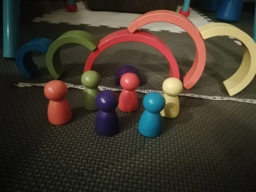 Без скидки дорогая радуга получается. Покупала примерно за 500 рублей. Размер небольшой. Есть небольшой дефект дерева, но прокрашено все хорошо. Без мешка для хранения.