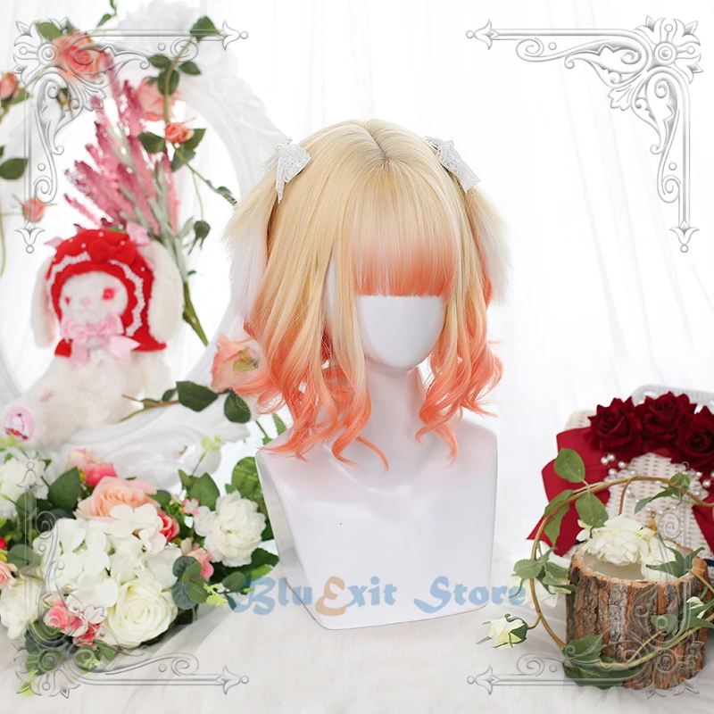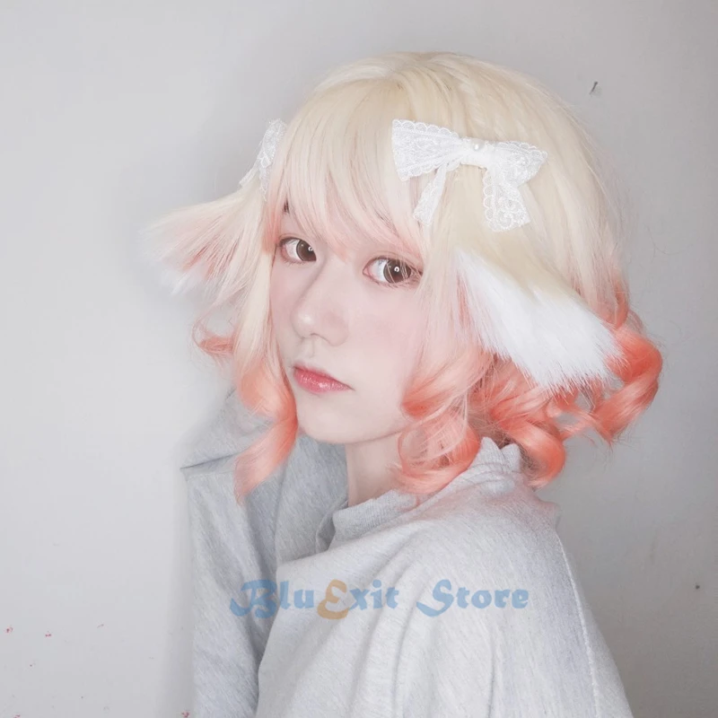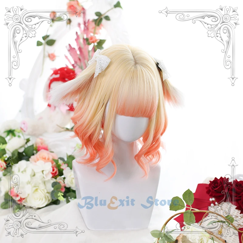 Градиентный желтый оранжевый парик Лолиты с ушками кролика бантом Харадзюку Волшебная челка для косплея вьющиеся короткие милые волосы с бахромой для взрослых девочек