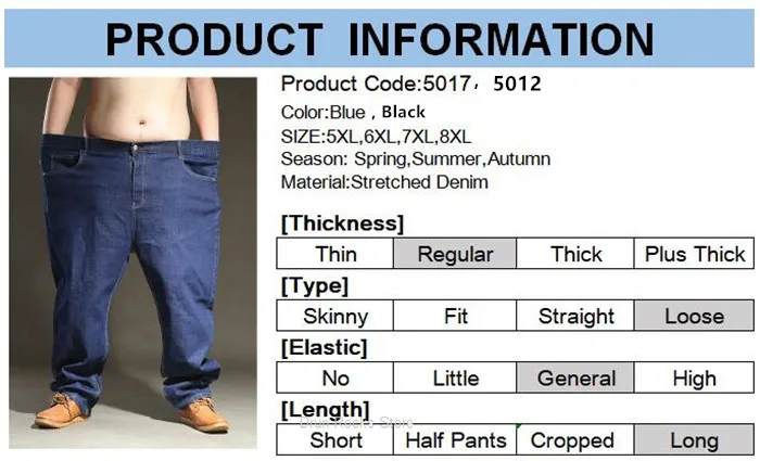 На рост 182 и вес 157 кг взял размер 8xl. Джинсы просто огромны. Материал по качеству не плохой и тянется хорошо. В связи с тем что джинсы тянутся, затруднен подбор по размерной таблице. Как уже было сказано 8xl для талии 150 см оказались на много велики. Посадка глубокая,что для пузатых не очень хорошо. Думаю 6xl были бы в пору, хотя не уверен.Доставка быстрая, за что спасибо продавцу.