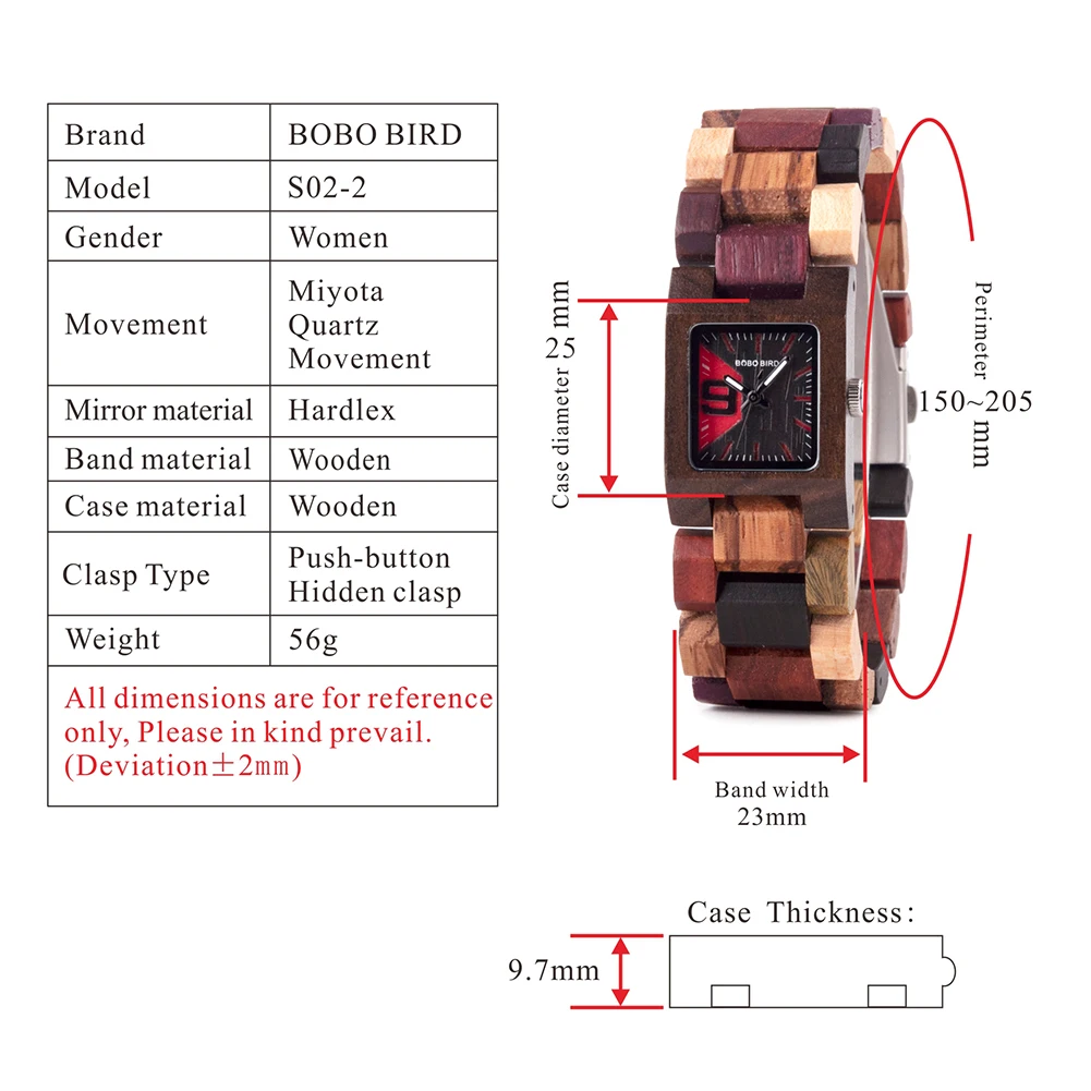 Бренд часов: BOBO BIRD Модель: GS002-2 Тип часов: деревянные наручные часы для женщин Стиль: Модный и повседневный Зеркало Материал: Hardlex Материал корпуса: 100% натуральная древесина Вес: 30 г (не включая Вес коробки) Максимальный диаметр: 37 мм
