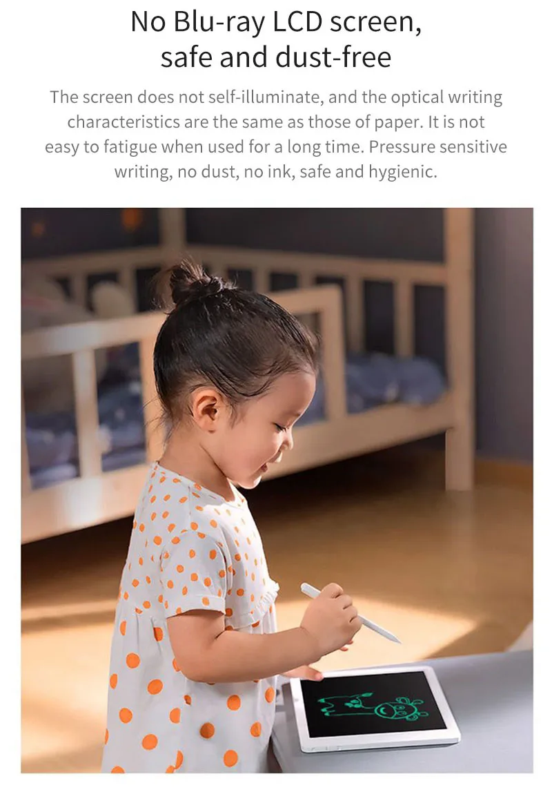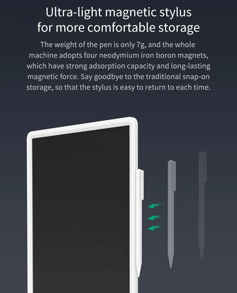Xiaomi Mijia LCD маленькая доска с ручкой-Вы можете рисовать, когда захотите, записывайте момент вдохновенияЧувствительное к давлению письмо; Супер чистый почерк; Магнитное поглощение; Светильник, легко носить с собой.-Индивидуальная Формула ЖК-пленки, четкий почеркМаленькая доска Xiaomi Mijia LCD принимает индивидуальную формулу жидкокристаллической пленки, сине-зеленый почерк, четкий и привлекательный дисплей, как реальный опыт написания традиционной бумаги, так и плавный опыт ЖК-экрана.-Высокочувствительная технология определения давленияТолщина почерка меняется с силой.-Одна кнопка, чтобы очистить низкое энергопотребление, длительный срок службы батареи является более беззаботнымЖК-экран с нулевой мощностью потребляет только небольшое количество энергии, когда он очищается. Если вы удаляете 100 раз в день, аккумулятор кнопки используется для 365 дней.-Ультрамагнитный стилус-светильник для более удобного храненияВес ручки составляет всего 7 г, и вся машина использует четыре неодимовых магнита из железного бора, которые обладают сильной адсорбционной способностью и долговечной магнитной силой.-Ультратонкий корпус, легко носить с собойТонкий корпус 7 мм тонкий, светильник и портативный, что снижает нагрузку на путешествия.