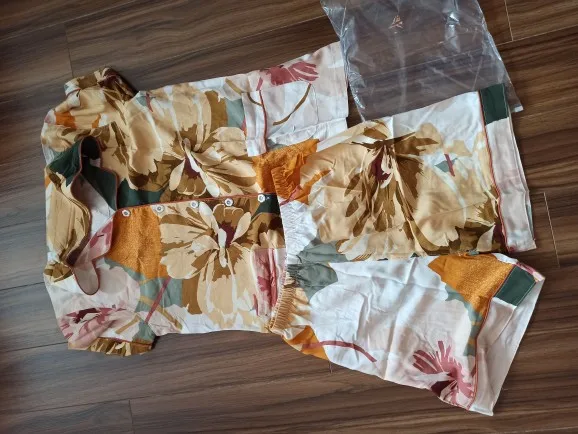 Пижамка классная! Выглядит так же, как на фото продавца, но в реальности цвета чуть более тусклые. https://s.click.aliexpress.com/e/_APvE59 У рубашки отложной воротник. Карманы накладные. Пуговицы пластиковые в форме цветка. Пояс шорт на резинке. Резинка не тугая, тянется хорошо. Внизу отвороты с окантовкой. Материал средней плотности. Приятный на ощупь, не тянется, легко гладится. На ярлыке указано, что это 100% вискозное волокно. На рост 162 см, вес 51 кг, 84-62-91 отлично села М-ка. Пошив хороший. Было немного ниточек. Доставка быстрая, с отслеживаемым трек-номером.