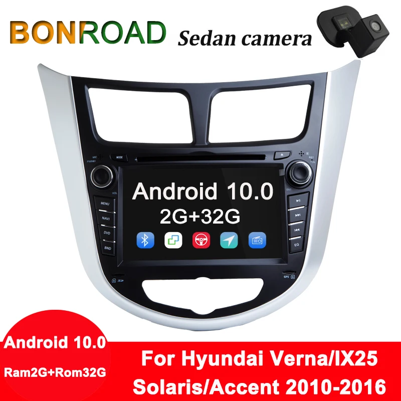 Автомобильный мультимедийный проигрыватель Bonroad, Android 10, ОЗУ 2 ГБ + ПЗУ 32 Гб, автомобильный DVD-проигрыватель для Solaris, Verna, Accent 2010-2016, Автомобильный GPS, радио, видеонаблюдение