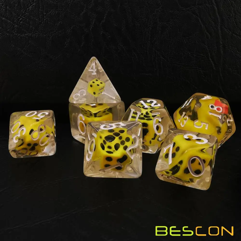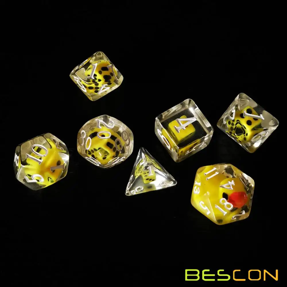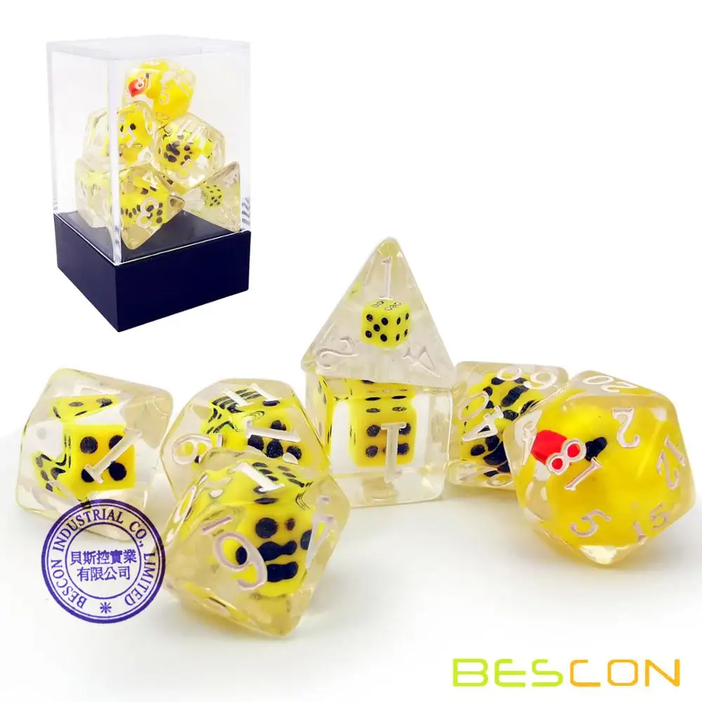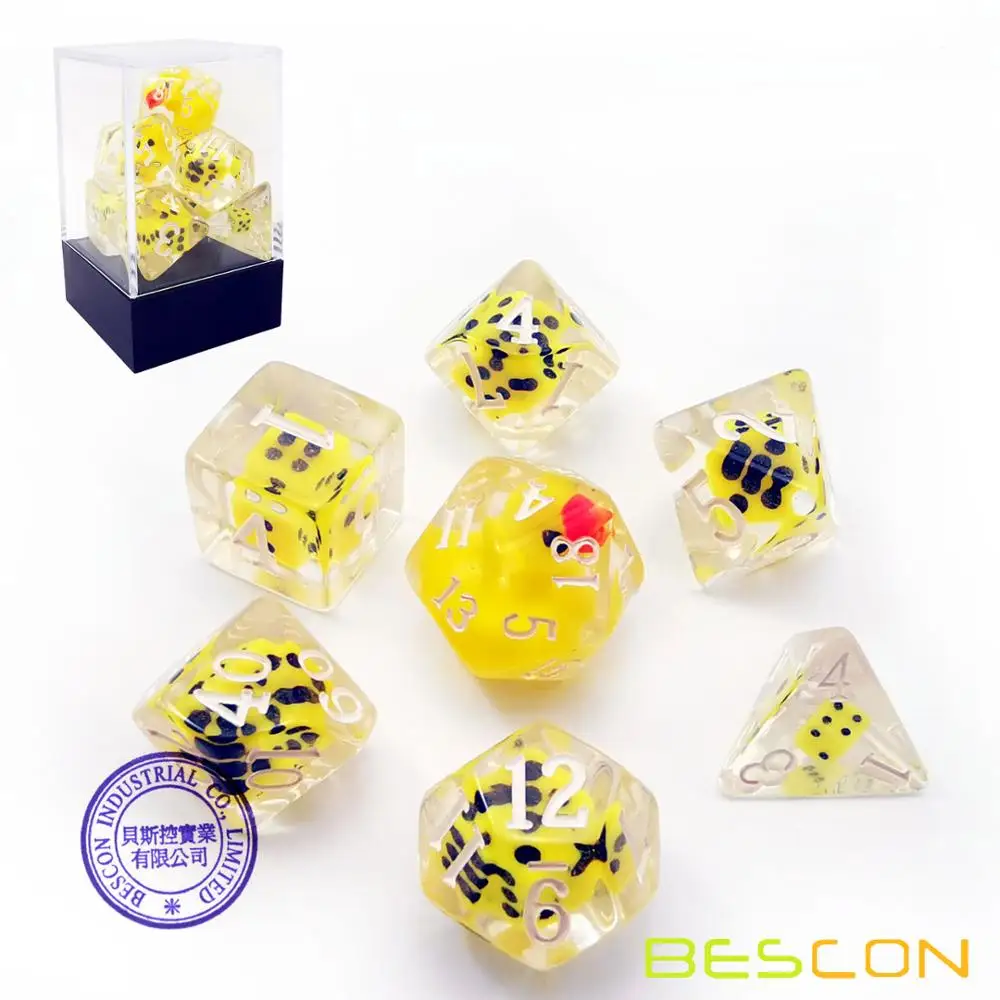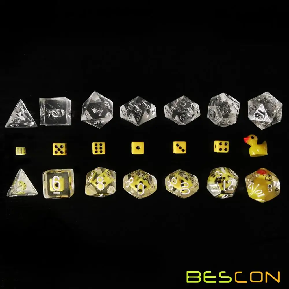 Набор игральных костей-это Веселая попытка.Мы помещаем в D20 милую желтую утку, и все Прозрачные Кубики вокруг маленькой желтой утки D20 набиты желтой мини-кубики. Для каждой из игральных костей ручной работы маленькие кубики и положение маленькой желтой утки будут немного отличаться. Когда вы смотрите на кости с разных сторон, внутренние кости и утка также изменяются из-за преломления светильник.