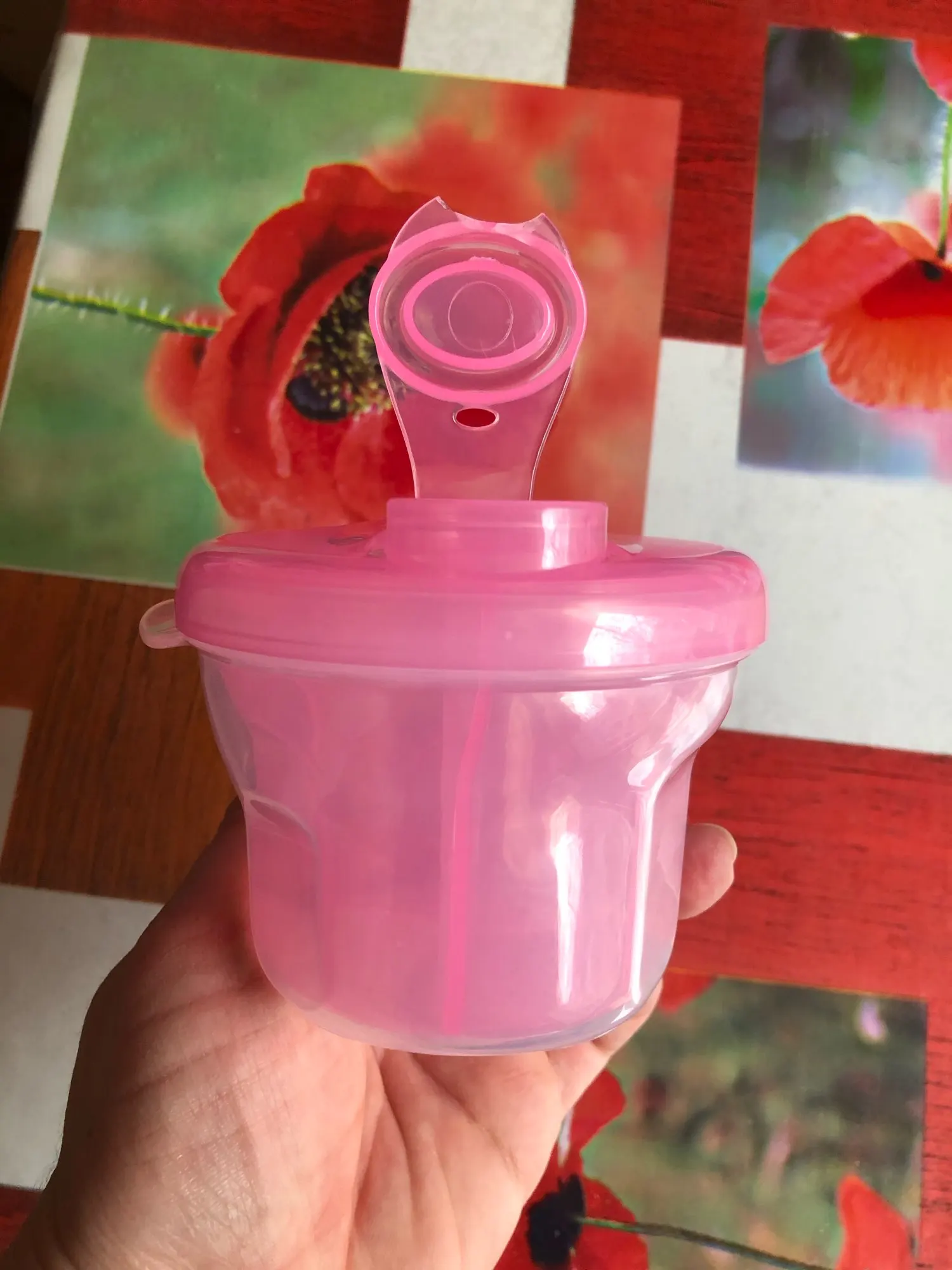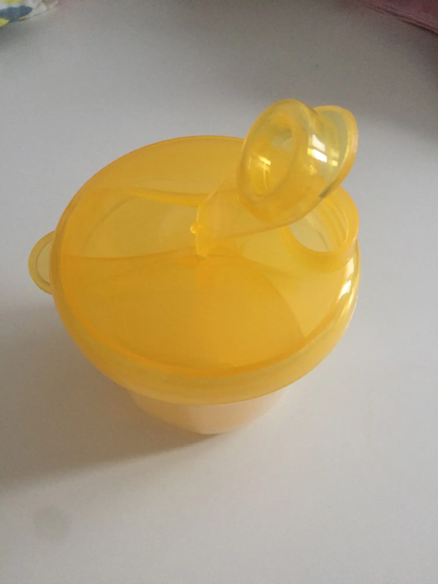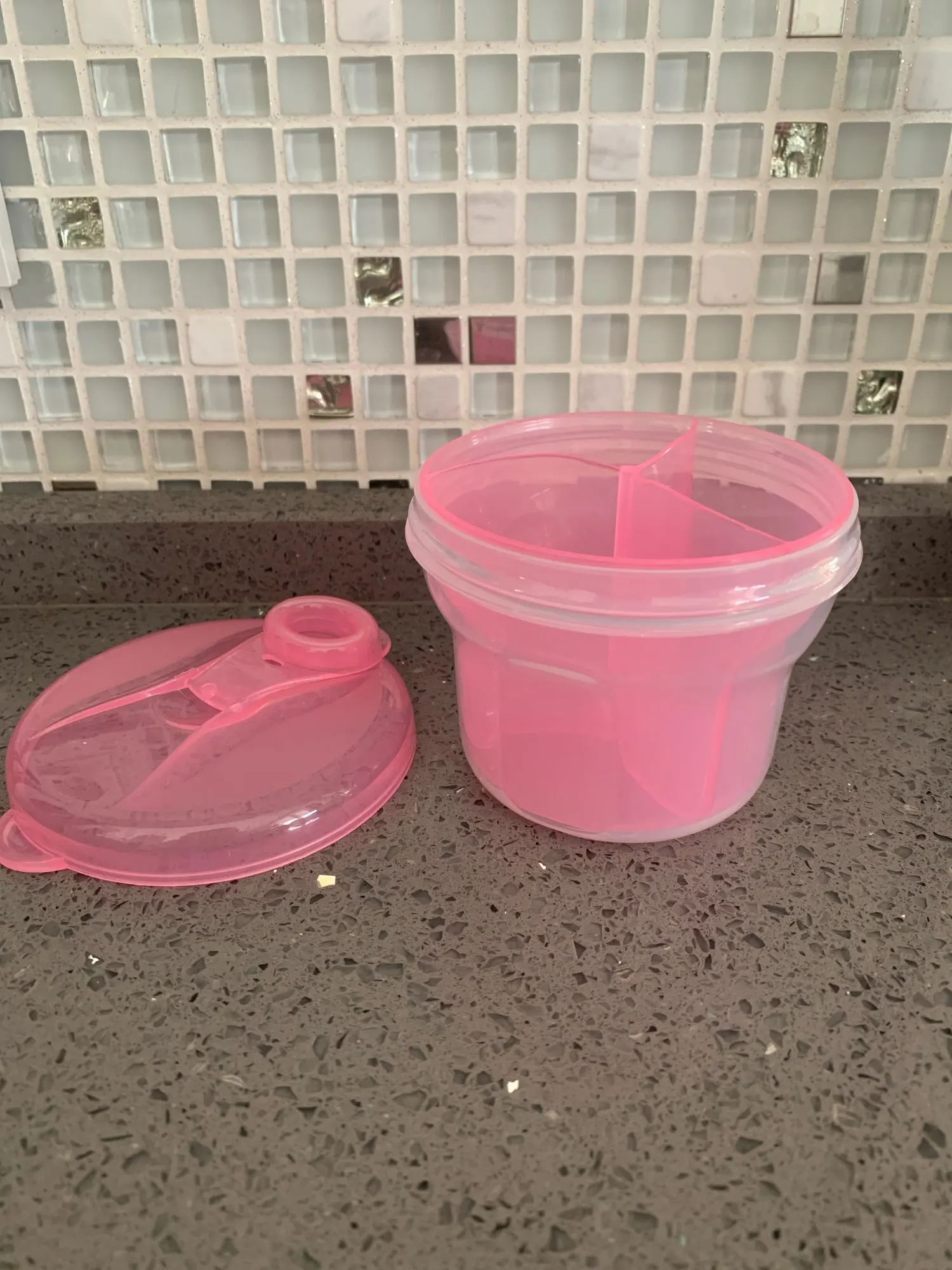 Удобный контейнер, как раз влазиет нужная дозировка ( 7 ложек смеси), в три отсека. Легко мыть. Крышка плотно закрывается и ничего не просыпается. Спасибо. Рекомендую.