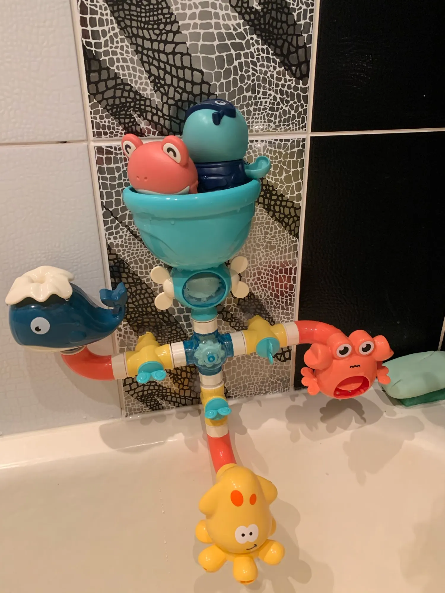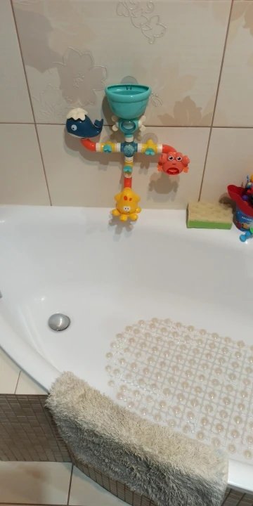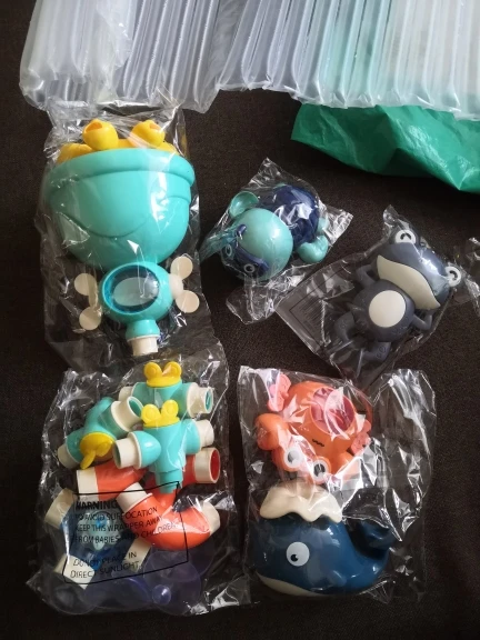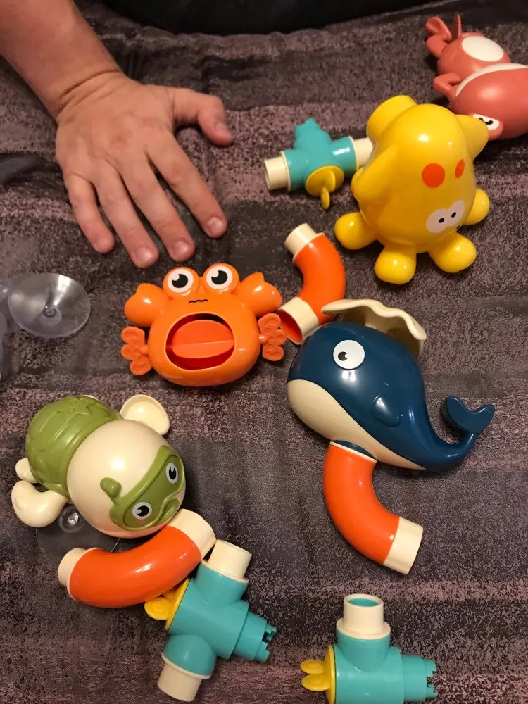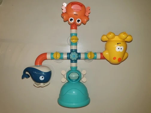 Игрушка сделана из качественного пластика, всё ровно, присоски хорошие, но сама по себе по функционалу бесполезна: из кита просто течёт вода - нет фонтана, из краба тоже просто течёт вода - лопасти особо не вращаются, единственное это осьминог вращается. Ребёнку (2 +) интереснее это всё разбирать и собрать. Из всего набора понравилась заводная черепаха.
