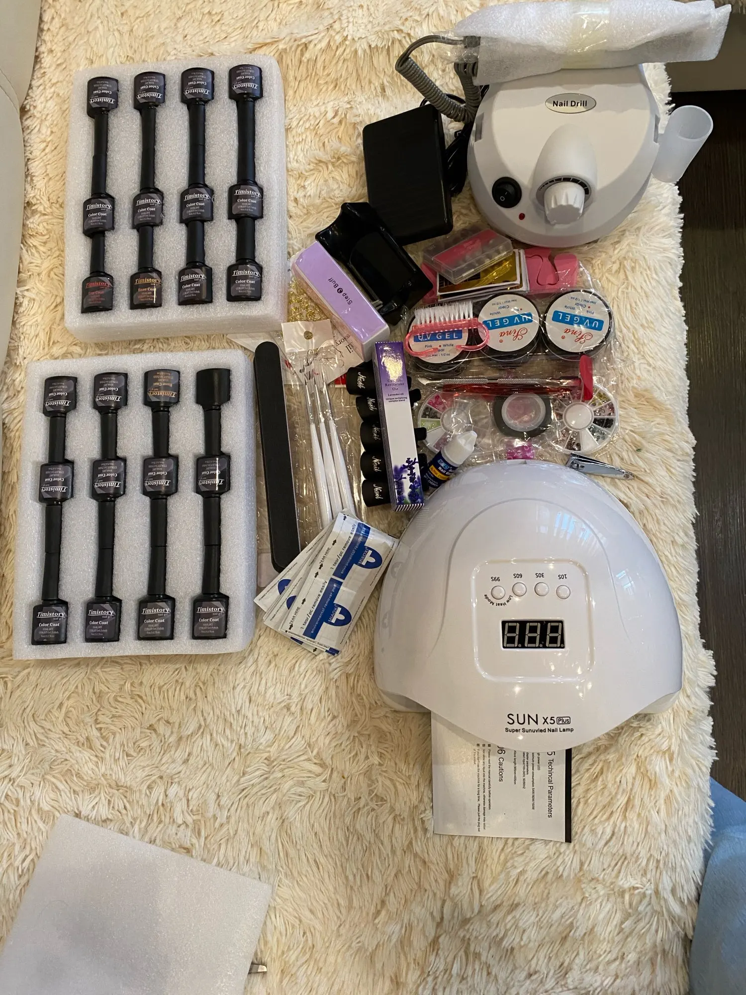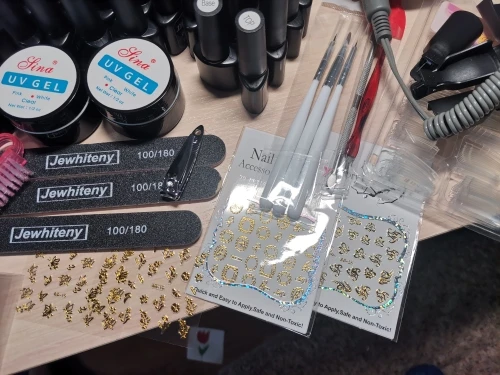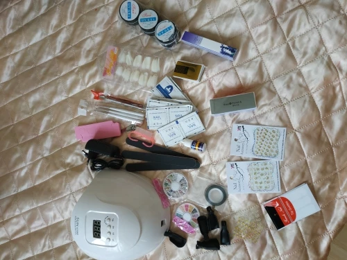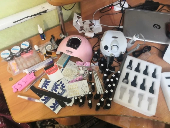 Замечательный набор за такие деньги. Лампа мощная, отлично сушит тонкий слой гель-лака за 10 секунд. Фрезер тоже очень хороший, но к нему нужно докупать фрезы, так как работать теми что идут в комплекте не получится качественно. Гель-лаки тоже понравились, буду использовать все цвета. Однотонные гель-лаки ложатся плотно, пигментация хорошая. Но вот блестящие лаки даже в несколько слоев остаются полу-прозрачными. Остальная мелочевка из набора так же порадовала. Все пришло целое, ничего не повредилось, не пролилось. Упакована посылка была на совесть, за это большое спасибо. Заказ шел 2 недели по России. Курьер принес домой. Рада что заказала именно этот набор, за него не жалко денег, полностью оправдал мои ожидания. Советую к заказу.