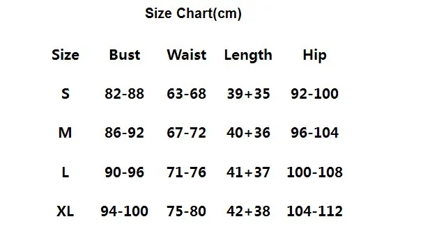 Размеры Обхват груди Обхват талии Длина Обхват бедер S 82-88 63-68 39 + 35 92-100 М 86-92 67-72 40 + 36 96-104 L 90-96 71-76 41 + 37 100-108 XL 94-100 75-80 42 + 38 104-112Разница в 2-3% в соответствии с измерениями вручную.