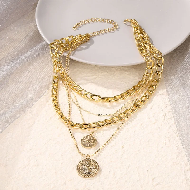 FNIO панк многослойное ожерелье-чокер с цепочкой для женщин, кубинское массивное толстое ожерелье портрет, винтажная резная монета, кулон, ювелирное изделие
