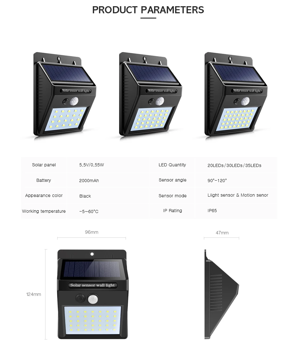 Наименование товара: светодиодный светильник на солнечной батарееИзлучаемый Цвет: белый (6000K-6500K)Количество светодиодов: 8 светодиодов/16 светодиодов/20 светодиодов/30 светодиодов/35 светодиодовМощность: 1 Вт/2 Вт/3 Вт/4 Вт/5 Вт солнечная панель: 0,44 Вт/0,65 Вт/0,65 Вт, 17% efficienc li-ionАккумулятор: 2.22WH / 1200mAhСветодиодный Тип: 2835 SMDЛюмен: 180LM/360LM/460LMВремя задержки: 10 с Ночной Датчик:<10 люксПереключатель: выкл/АвтоВодонепроницаемость: IP65Светодиодный срок службы: 50000 часовВремя зарядки на солнечной батарее: 8 часов освещенияРежим: выключение/высокий свет