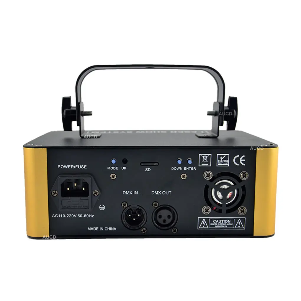 Режим ILD: режим ILDA play, циклический переход через один файл ILD (расширение файла ILD, не чувствительный чехол), короткое нажатие «вниз», чтобы изменить файл ILD, нажмите, чтобы изменить рабочую папку.Режим аудио: режим голоса, воспроизведение внутренней голосовой программы, Нажатие вниз, чтобы изменить чувствительность голоса.Автоматический режим: автоматический режим. Воспроизводите внутреннюю автоматическую программу.Режим Dmx: Режим DMX, нажмите вниз, чтобы изменить адрес DMX.Phasic Seet: Настройка фазы, нажмите «вниз», чтобы изменить фазу. Параметр:Скорость сканирования: 20 Kpps высокий шаговый двигатель, +-25 градусов.Режим воспроизведения: звук, авто, sd-карта, DMX512, M/Slave, проектор.Светильник источник: Red-650nm @ 200 МВт, Green-532nm @ 100 мВт, Blue-450nm @ 200 МВт.Сетевой Вход: AC 110-240V @ 50/60Hz (подходит для Globle Напряжение)Номинальная мощность: 20 ВтКлассификация лазера: Класс 3BТемпература: 0-40 °CDMX соединения: 3 контакта XLR папа/мамаDMX канал: 14 каналовРазмер изделия: 23x16x8.5смПосылка: 28x22x18 смВес нетто: 1,7 кгВес брутто: 2,15 кг Посылка: