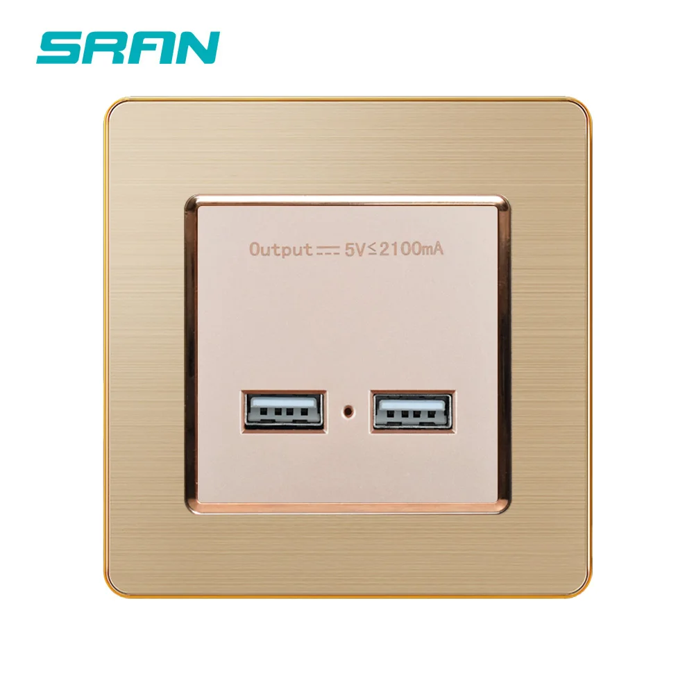 Настенная розетка SRAN с двумя USB-портами, умный зарядный порт для мобильного телефона, выход 5 В, 2,1 А, панель из нержавеющей стали