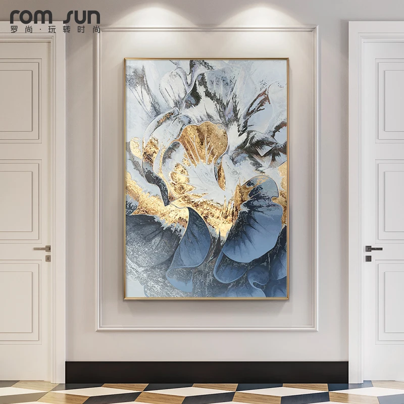 Современная Абстрактная Золотая фольга, плавучая голубая Картина на...