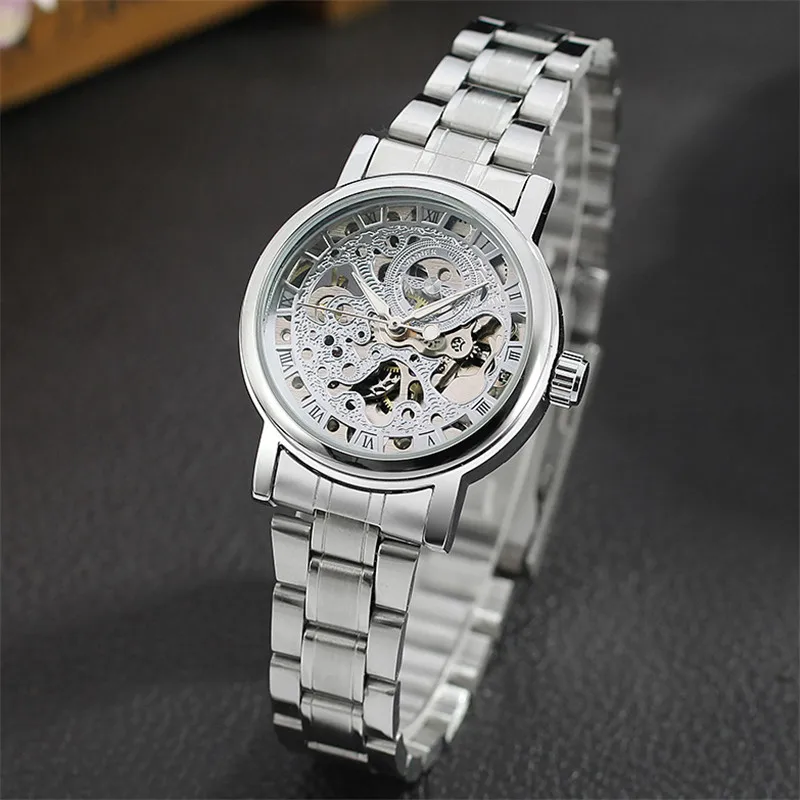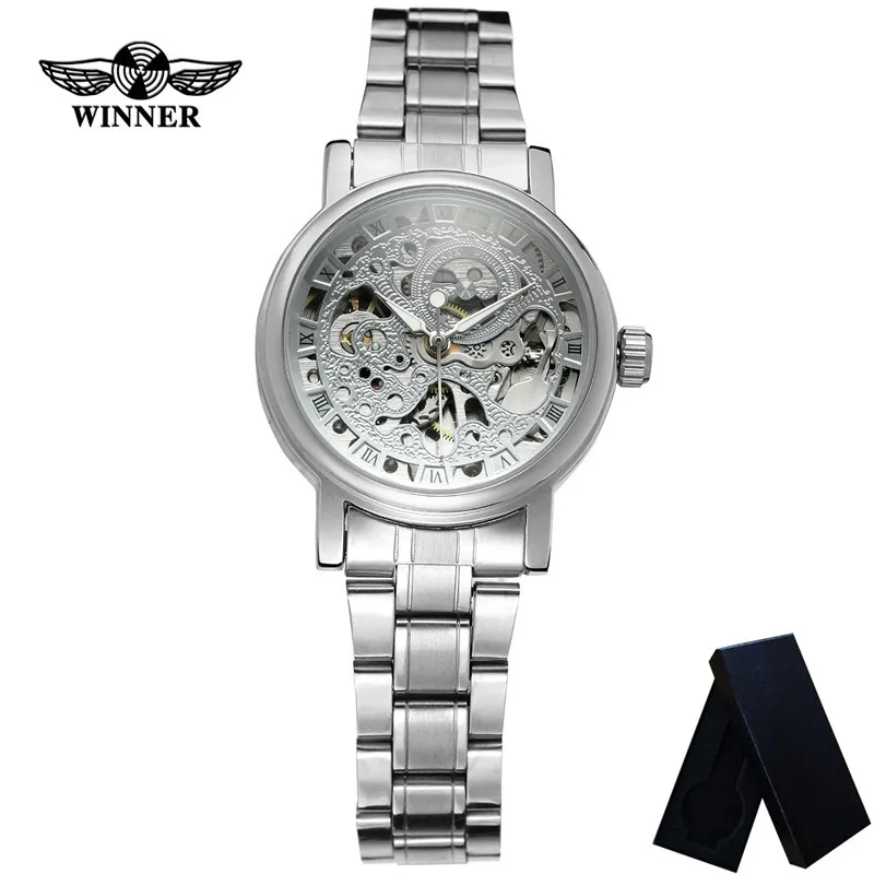 Женские Механические наручные часы WINNER, классические Серебристые часы-скелетоны из нержавеющей стали, 8005