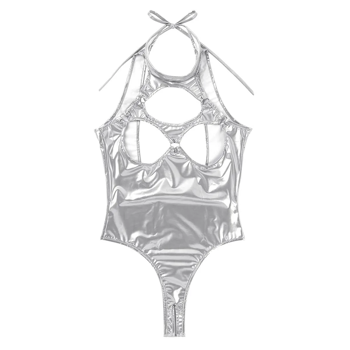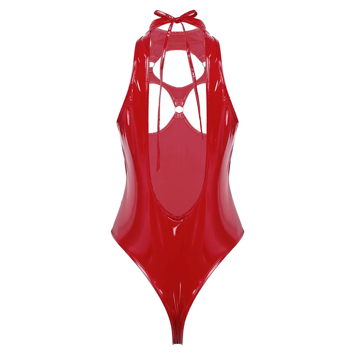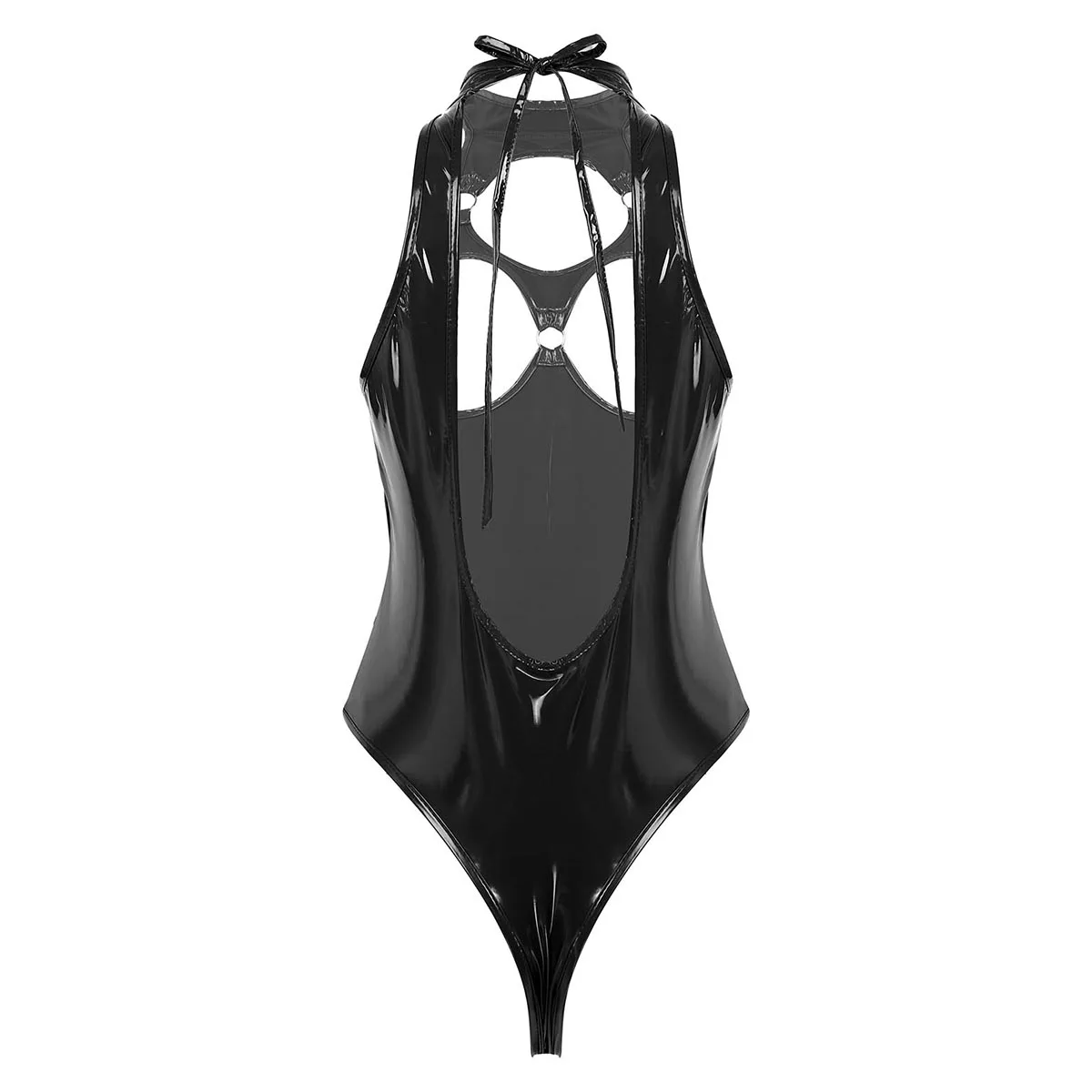 Женский однотонный пикантный костюм из лакированной кожи с вырезом на шее, без рукавов, сексуальное боди, женское белье, открытые чашечки