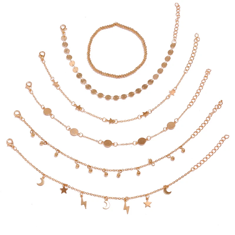 Винтажные ножные браслеты в стиле бохо, ювелирные украшения для щиколотки золотого цвета, звенья, цепочка с бусинами, звезда, молния, месяц, ювелирные изделия для женщин, 6 шт.компл.