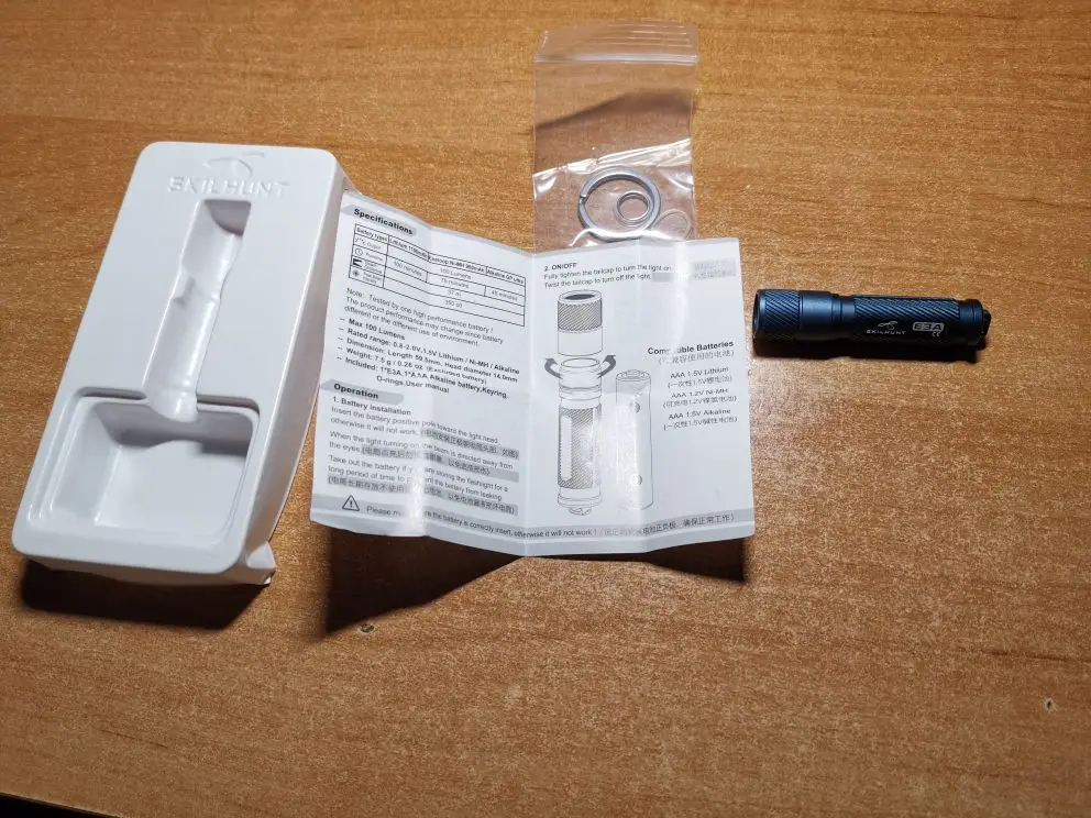 Быстрая доставка.2 недели Отличная подарочная упаковка.Оказался самым маленьким изо всех наключников на ААА(10440).Свет рассеянный,стоит TIR линза.На взгляд 5700К.В комплекте 2 заводных кольца и 2 О-ринга, инструкция.Пока очень туго закручивается,надеюсь притреться .Качество изготовления на высоте.Идеально для подарка Жаль ,что только 1 режим.