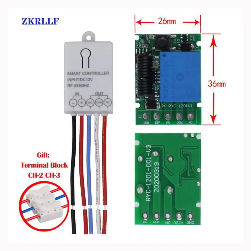 О режиме работы:Мгновенный: Нажмите кнопку дистанционного управления, реле подключается, отпустите кнопку дистанционного управления, релейное соединение.Переключение: Нажмите, как только кнопка дистанционного управления, реле подключается, нажмите дважды кнопку дистанционного управления, реле соприкосновения.Блокировка: Нажмите кнопку дистанционного управления A, реле подключается, нажмите кнопку дистанционного управления B, реле соприкосновения.Режим задержки Tiem: Нажмите кнопку дистанционного управления, реле подключается, от когда отпустите кнопку дистанционного управления, после 5s или 10s или 15s или 20s, реле отключается автоматически.Автоматическое включение при включении питания: когда источник питания, реле подключается.Очистка кода:После нажатия кнопки обучения приемника 9 раз приемник очищает все данные дистанционного управления в своей памяти.В тех случаях, когда светодиодный вспышки для 5 несколько раз, это означает, что четкое функциональное будет завершен.(После очистки кода в приемнике, все пульты дистанционного управления должны снова учиться у приемника, чтобы перезапустить.)Настройки режима работы приемника1. Изучение кода: (мгновенный)Нажмите кнопку обучения на приемнике один раз, он приходит в мгновенный режим настройки.Подождите немного, светодиодный индикатор включится, он войдет в состояние обучения. Нажмите кнопку дистанционного управления,Светодиодный индикатор на плате приемника будет мигать 3 раза, а затем выключаться, успешно обучаясь.2. Изучение кода: (переключение)Нажмите кнопку обучения на приемнике дважды, он приходит в режим переключения настройки ждатьВ данный момент светодиодный индикатор включается, он приходит в состояние обучения. Нажмите кнопку дистанционного управления, светодиодный индикаторНа плате приемника будет мигать 3 раза, а затем выключаться, успешно обучаясь.3. Изучение кода: (фиксация)Примечание: Когда вы выбираете режим блокировки, чтобы узнать больше дистанционного управления, вам нужноИзучите две разные кнопки, первый раз выучен для «ON», второй раз выучен для «OFF».Например: Кнопка A = ON, кнопка B = OFF, тройное нажатие кнопки обучения на приемнике,Он переходит в режим фиксации. Подождите немного, светодиодный индикатор на плате thereceiver будет включен,Нажмите кнопку дистанционного управления A, светодиодный фонарик 3 раза. Нажмите кнопку дистанционного управления B. Светодиодный индикатор вспышки для 3Время и затем выключаются, обучение успешно.4. Изучение кода: (режим задержки времени)Нажмите кнопку обучения на приемнике вперед время, время в течение 5 секунд.Нажмите клавишу обучения на приемнике в пятый раз, время задержки в течение 10 секунд.Нажмите клавишу обучения на приемнике в шестом раз, время задержки в течение 15 секунд.Нажмите кнопку обучения на приемнике семь раз, время задержки в течение 20 секунд.Светодиодный индикатор будет выключен.Нажмите кнопку дистанционного управления, светодиодный индикатор мигает и выключается, обучение успешно.5. Изучение кода: (автоматическое включение при включении питания)Нажмите кнопку обучения на приемнике восемь раз, он приходит в режим настройки Подождите немного,Светодиодный индикатор включается, он приходит в состояние обучения. Нажмите кнопку дистанционного управления, светодиодный индикатор наПлата приемника ми