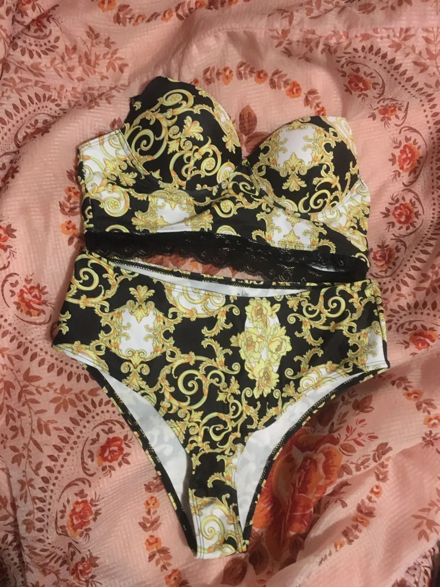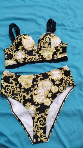 Купальник по качеству хороший,но размерная сетка не совпадает!Объем лифа большой в размере L,а чашечки крайне маленькие!Моя грудь туда не поместилась даже наполовину,а в объеме болтается!Трусы также большие на российский 46,бёдра 95 см.Чашечки на грудь не более 2 размера.Жалко,конечно.Доставка быстрая совместно с другими посылками.