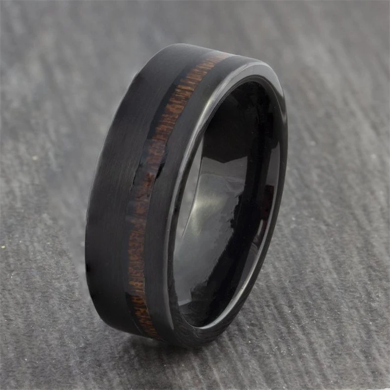Высококачественное титановое кольцо для мужчин. Кольцо из нержавеющей стали с черной поверхностью и длинной деревянной текстурой. Модный мужской стиль