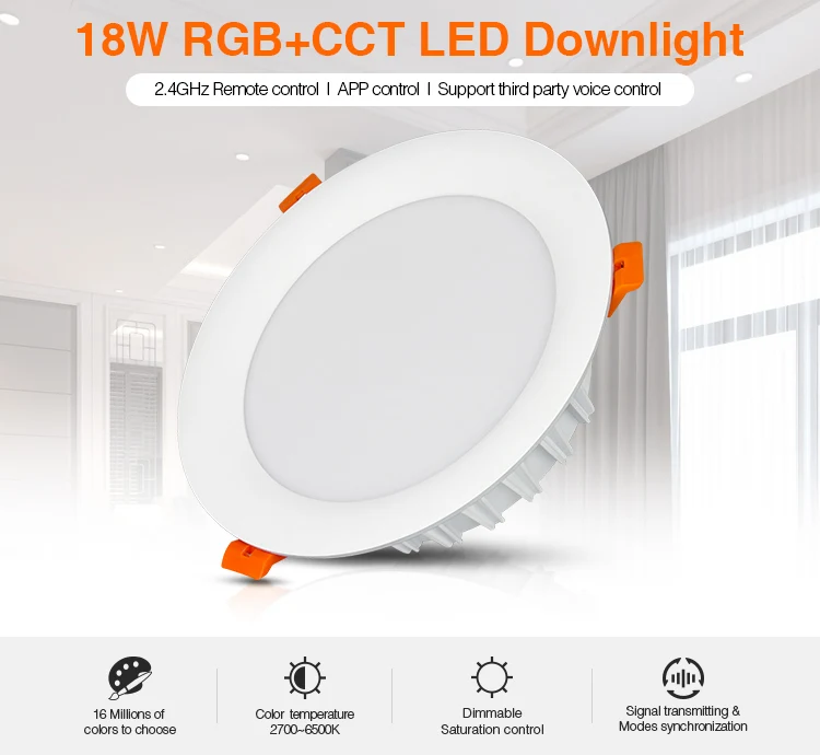 Название продукта: Светодиодный светильник 18 Вт RGB + CCT Номер модели:FUT065 Мощность: 18 Вт Напряжение: AC100 ~ 240 В Гц Кельвин: 2700-6500K Световой поток: 1500 лм Световой КПД: 85 лм/Вт CRI: >80 Угол свечения: 120 ° PF: > 0,5 Срок службы: 50000 часов Угол свечения: 120 ° Дистанция управления: 30 м Размер отверстия: Ø150 мм Материал: алюминий