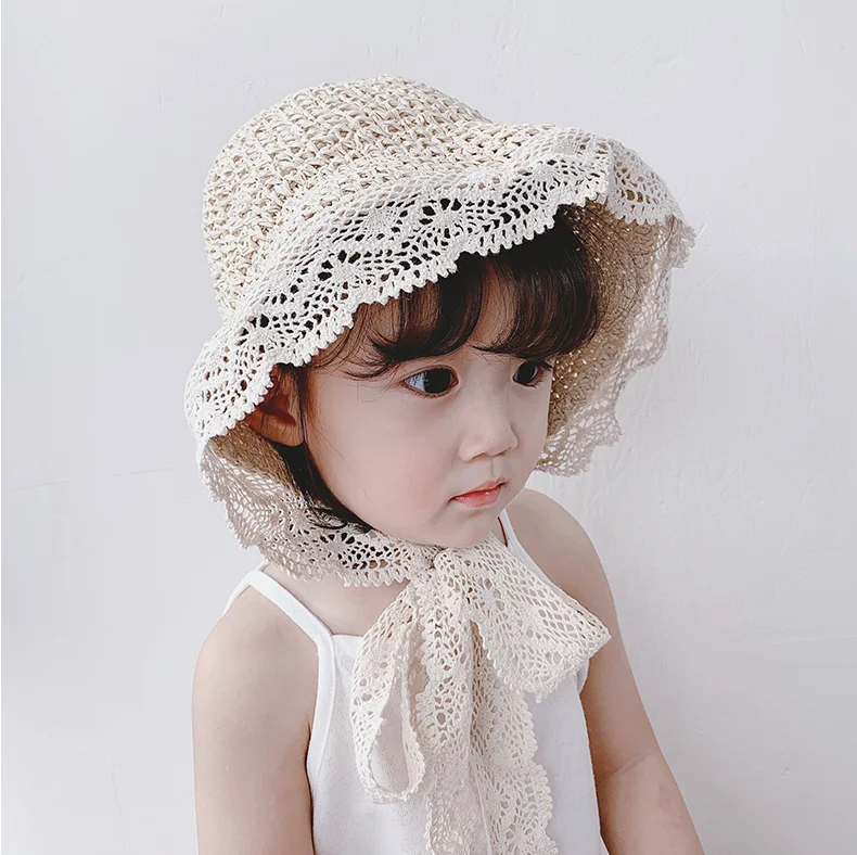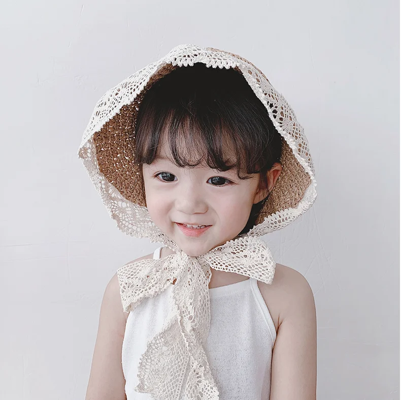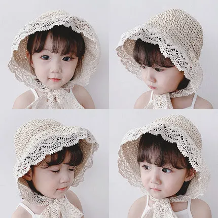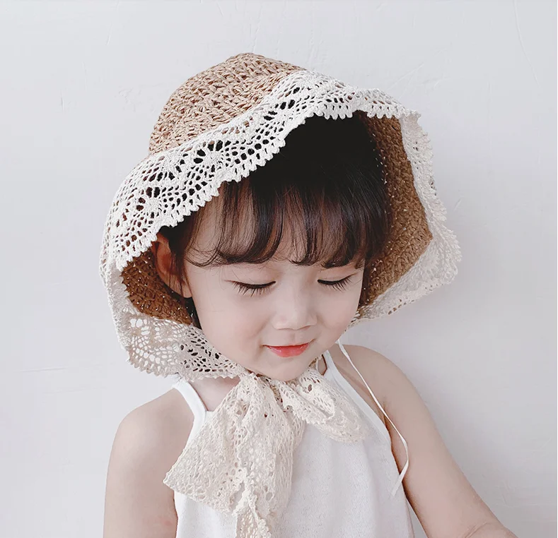 Летняя детская соломенная шляпа, милая дышащая кружевная шнуровка, Пляжная Солнцезащитная шляпа с широкими полями, ветрозащитная однотонная шляпа