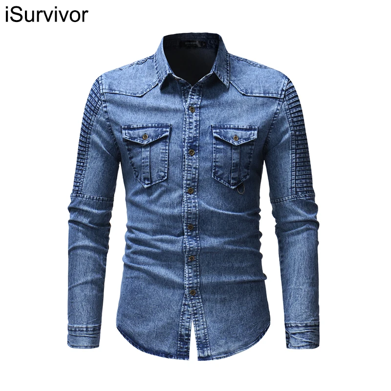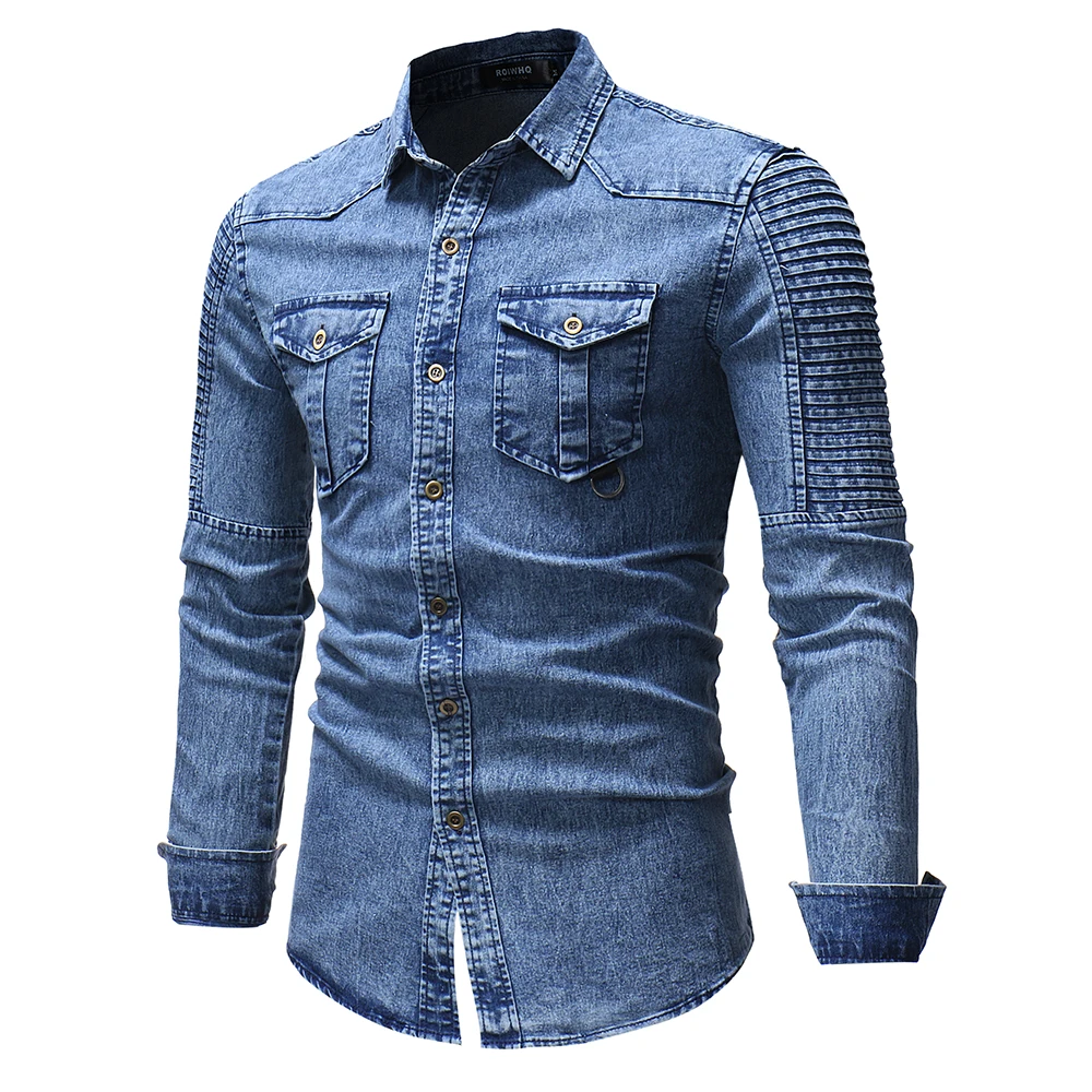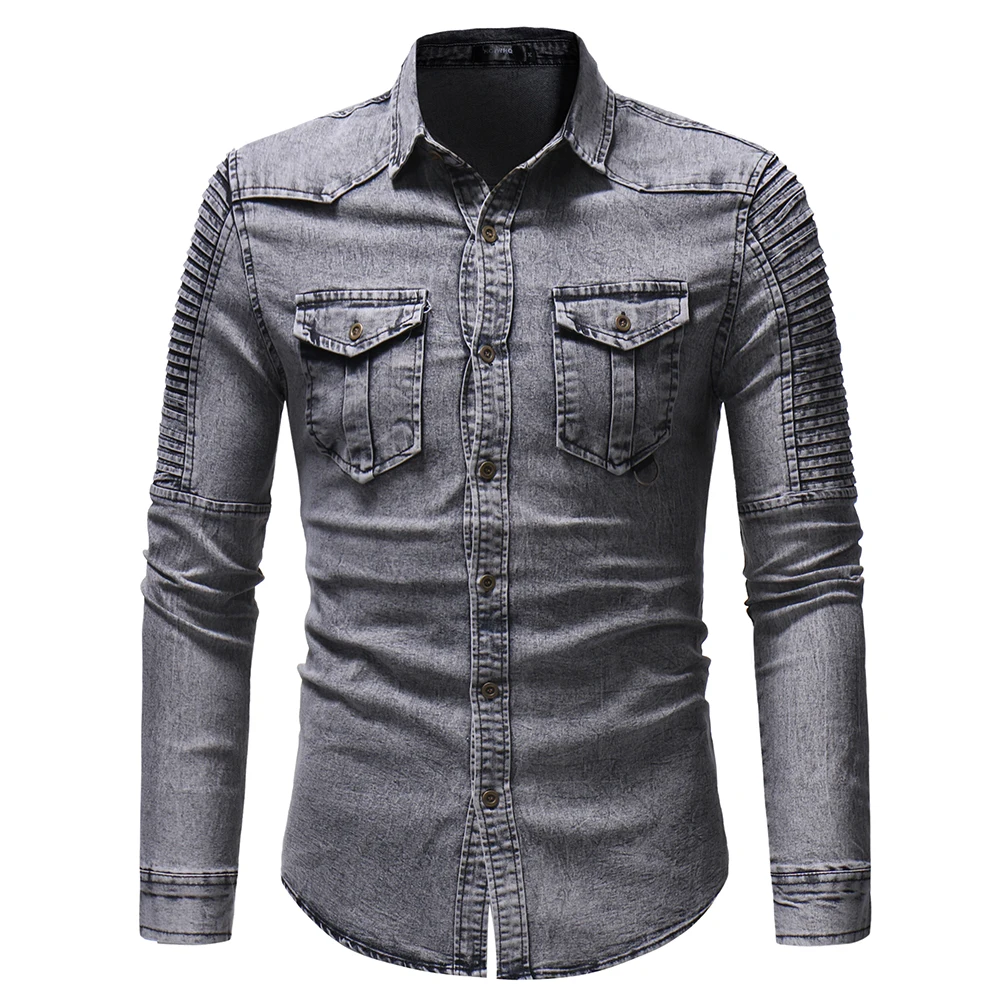 Джинсовая мужская рубашка, модная плиссированная Повседневная локом...
