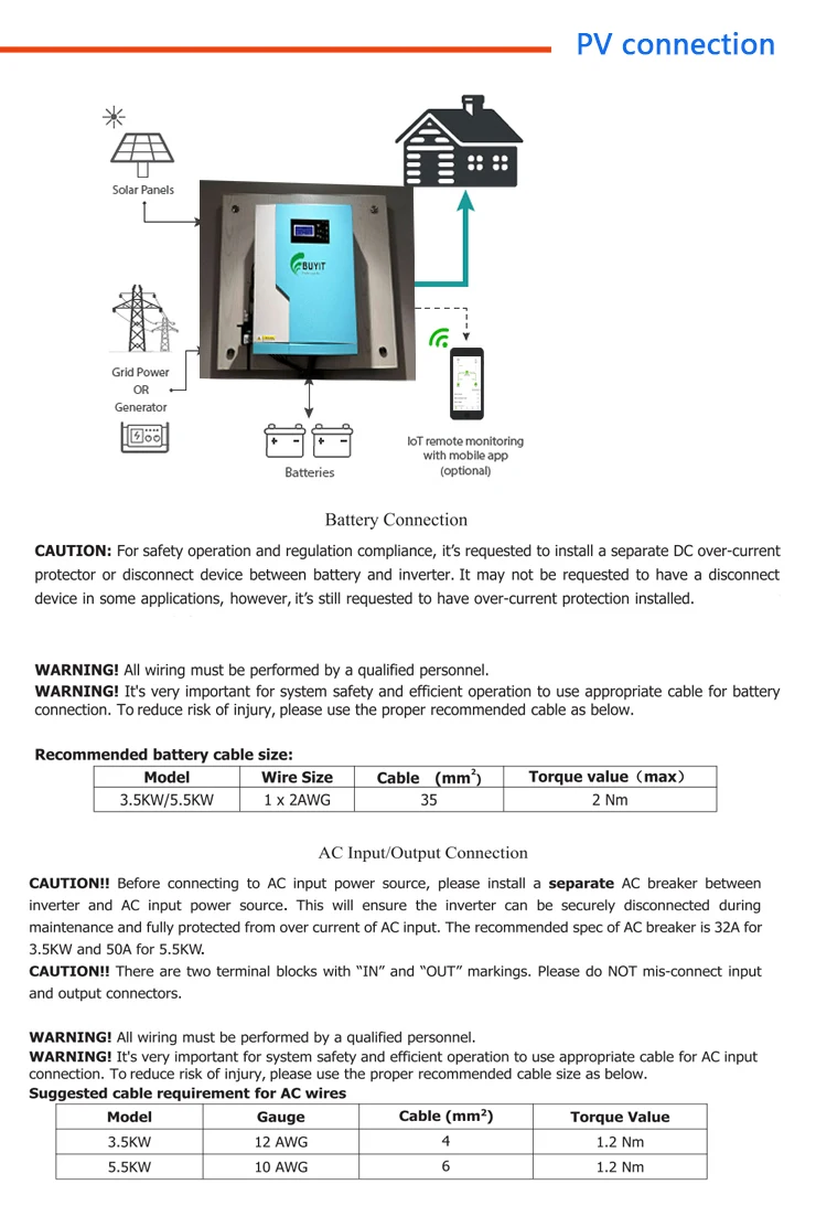 Выбор модуля PV:При выборе правильных модулей PV, пожалуйста, убедитесь, что рассмотрели следующие параметры:1. Напряжение открытого замыкания (Voc) PV модулей не превышает макс.. PV массив напряжения цепи открытого замыкания инвертора.2. Напряжение разомкнутой цепи (Voc) фотоэлектрических модулей должно быть выше минимального напряжения батареи.