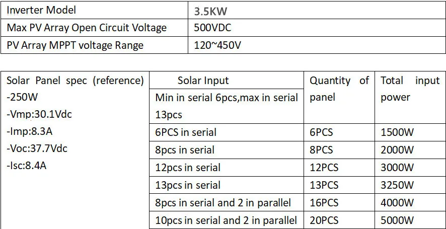 Минимальное рабочее напряжение MPPT должно быть 150 в, чтобы убедиться, что устройство начинает работать, и 360 в является лучшим. Если у вас есть какие-либо проблемы, пожалуйста, свяжитесь с нами вовремя, спасибо :)