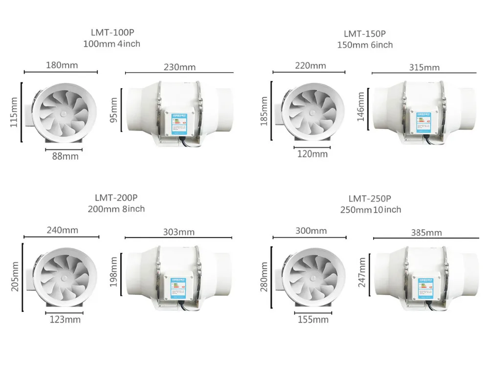 -Размер воздуховода: 4 "/ 5''/6 ''/8''/10''-Напряжение: 220 В/60 Гц-Скорость ветра (m⊃ 3;/ч): 220-1800-Входная мощность: 35 Вт/45 Вт/75 Вт/130 Вт/175 Вт-1,5 м EU/US/AU/JP-штепсельная вилка