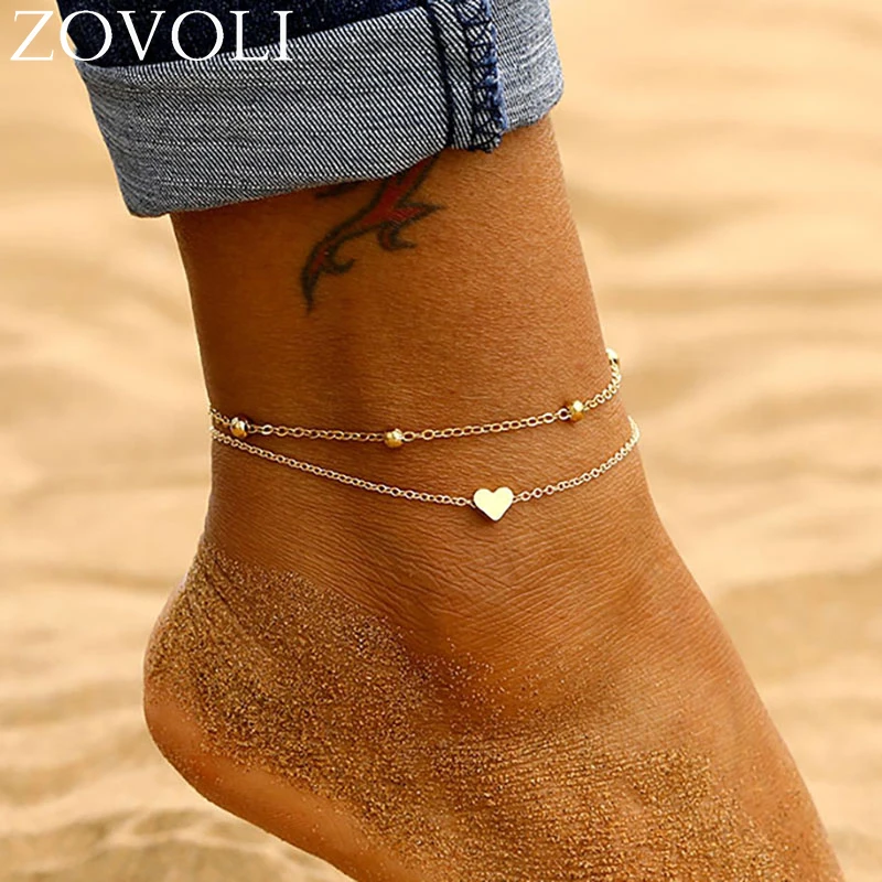Женский двухслойный браслет ZOVOLI, золотой браслет на щиколотке с подвеской в виде сердца и бусинами, ювелирные изделия для пляжа