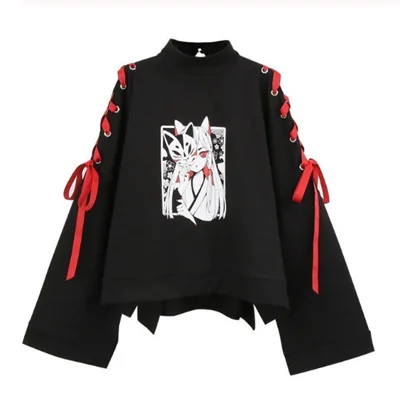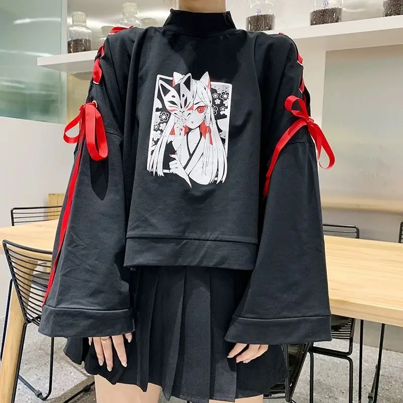 Осенние Хлопковые женские японского аниме Стиль с лисой из двух предметов: толстовка с капюшоном и рисунком котенка белого цвета в стиле Харадзюку для студенток Свободный Топ с расклешенными рукавами S-XL