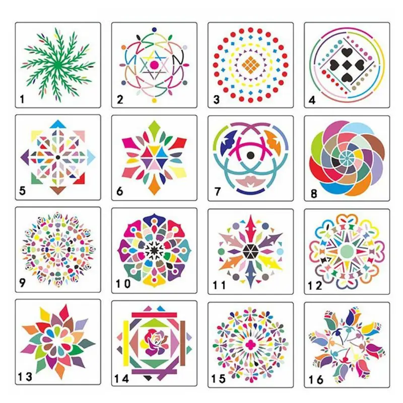 Просто следуйте контуру трафаретов, а затем выразите свое творческое воображение, пробуя различные узоры Мандала с различными размерами инструментов для рисования.